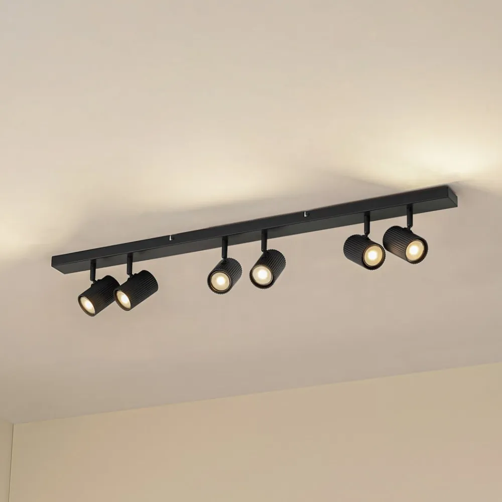 Kardis loftlampe imponerer med sit moderne design og brugen af højkvalitets aluminium og jern. Konstruktionen med 6 lyskilder sikrer en jævn belysning, der skaber en behagelig atmosfære i både entreen og stuen. De enkelte spotlights kan drejes efter ønske, så bestemte områder eller genstande kan belyses målrettet.