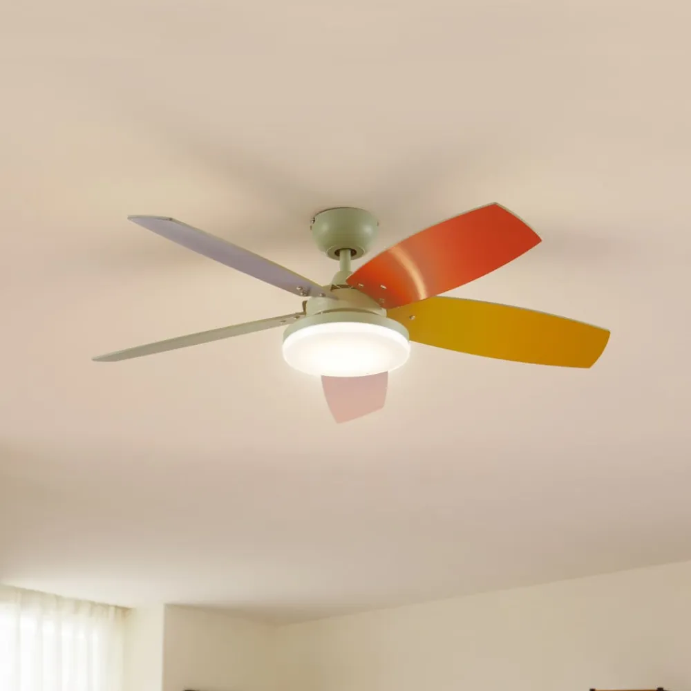 Jonte LED-loftventilator med farverige ventilatorblade og praktisk CCT-funktion Jonte LED-loftventilator kombinerer et legende, friskt look med funktionel belysning og skaber en atmosfære, der er både forfriskende og afslappende. Med den styrbare lysfarve (CCT) kan lyset justeres fra varme toner til en hyggelig aftenstemning til køligere nuancer, der fremmer koncentration og aktivitet. Den integrerede LED-lyskilde giver ikke kun energieffektiv belysning, men er også udstyret med en integreret lysdæmper, der giver mulighed for individuel styring af lysstyrken. Dette belysningselement er et ideelt valg til stuer, spisestuer og soveværelser, hvor det tilfører en frisk accent med sit moderne design og farverige farveskema. Jonte LED-loftventilatoren repræsenterer en moderne og ung boligkultur, der værdsætter stil og funktionalitet. Oplev, hvordan lys og bevægelse spiller harmonisk sammen og sætter et særligt præg på ethvert rum. Tekniske data – jævnstrømsmotor – 4 W ved 99 o/min – 29,2 W ved 130 o/min – 40 W ved 163 o/min – luftcirkulation 60/85/146,8 m³/min – optimal rumstørrelse 7-12 m² – lydeffektniveau 53 dB (A) – inkl. fjernbetjening (ekskl. batterier)