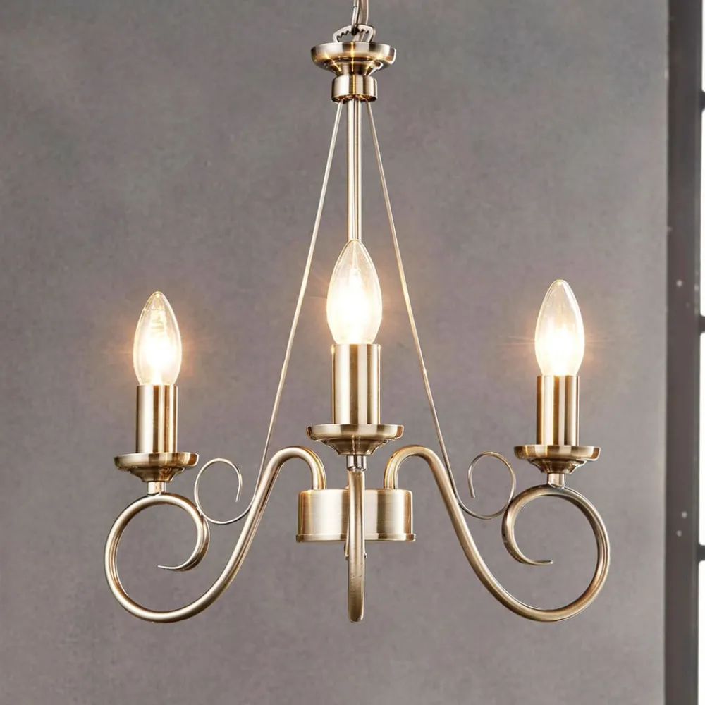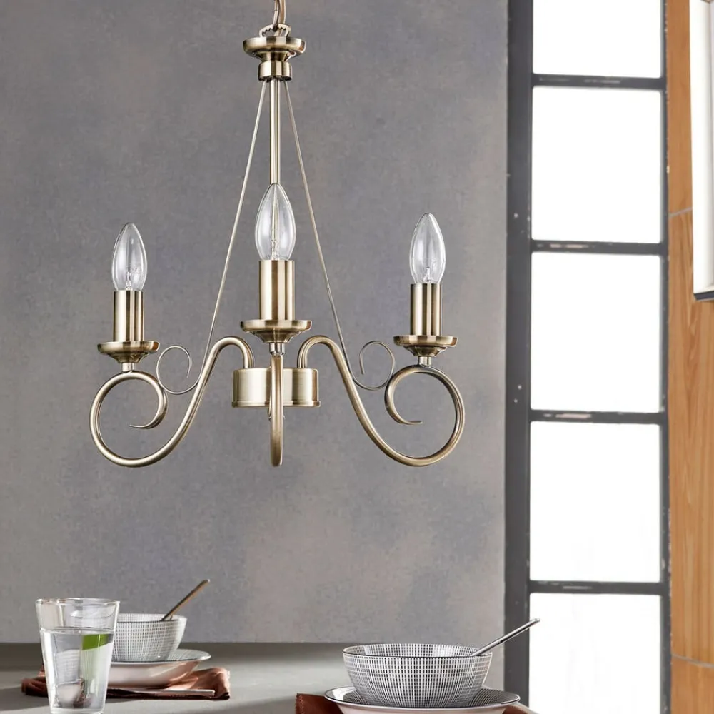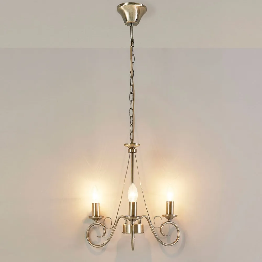 Smuk Marnia lysekrone i antik messing i en 3 lyskilder version Alt ved denne lysekrone ser elegant og sublimt ud, hvilket gør den til en fantastisk tilføjelse til spise- og opholdsområder, som straks ser lidt mere glamourøse ud i Marnia’s lys. Hele rammen er udført i antik messing: fra lysestagerne til lampearmene og midten til kæden og loftsophænget. Det skaber et harmonisk samspil, der kan sidestilles med elegance og stilfuldt udtryk. Lampearmene i metal ligner romantiske ranker, fordi de er så smukt snoede og derfor ser lidt mere legende ud.
