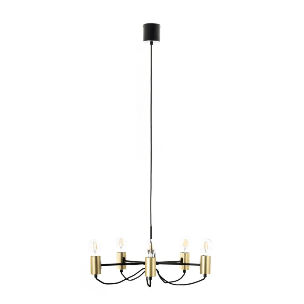 Elegant Prospa lysekrone med fem åbne lyspunkter Denne lysekrone har uden tvivl et meget moderne look og er derfor et meget moderne belysningsobjekt i lysekroneform. Den har ingen skærme, så fokus er direkte på lyskilderne, som derfor er meget fremtrædende og bør vælges med henblik på at skabe det rigtige look. Filamentpærer med effektiv LED-teknologi anbefales, gerne med en lidt større kugleform. Rammen er sort, armene er elegant buede, og fatningerne er hver især omgivet af et element med en dekorativ messingfinish. Prospa-lysekronen er det perfekte valg for alle, der ikke vil gå på kompromis med modernitet eller en sofistikeret lysekrone-stil! Et spisebord i en moderne boligindretning bliver sat i scene på en særlig stilfuld måde.