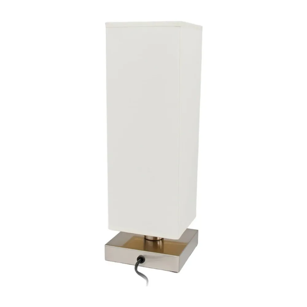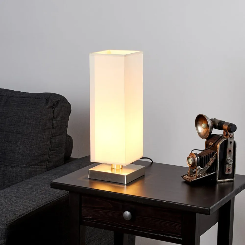 Kantet natbordslampe Martje med cremehvid stofskærm til E14-pærer Der skabes et smukt skær, når du tænder for denne natbordslampe, som selvfølgelig også er ideel som ekstra belysning i stuen eller entreen. Den kan placeres på et sidebord, en kommode eller i vindueskarmen og bliver et behageligt lyst fokuspunkt. Den kan monteres med E14-pærer.