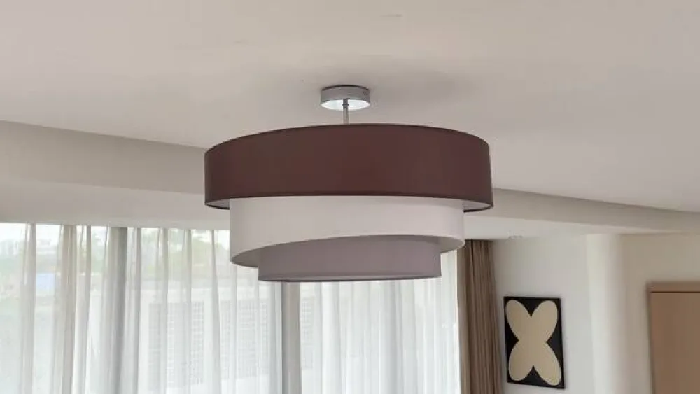 En lyskilde med et harmonisk udseende i brun, hvid og grå: Melia stofloftlampen Stofskærmen på Melia loftlampen er noget helt særligt, da den består af tre individuelle dele, der delvist overlapper hinanden, og hvor diameteren falder fra det ydre til det midterste til det indre element. Den delvist skrå ende af de enkelte skærme er meget iøjnefaldende og bidrager til et særligt udseende, der er præget af større individualitet. Lysbilledet opfattes af beskueren som hyggeligt og indbydende, belysningen er tilpas kraftig, selv om den valgte type lyskilde naturligvis også er afgørende her.
