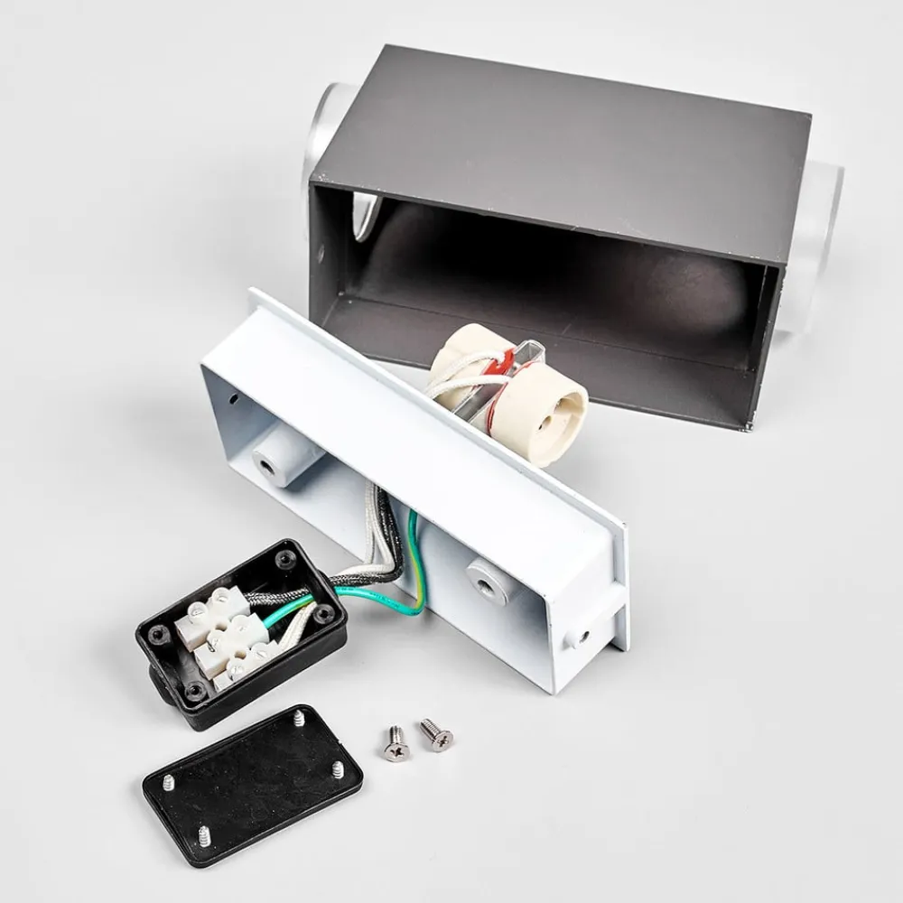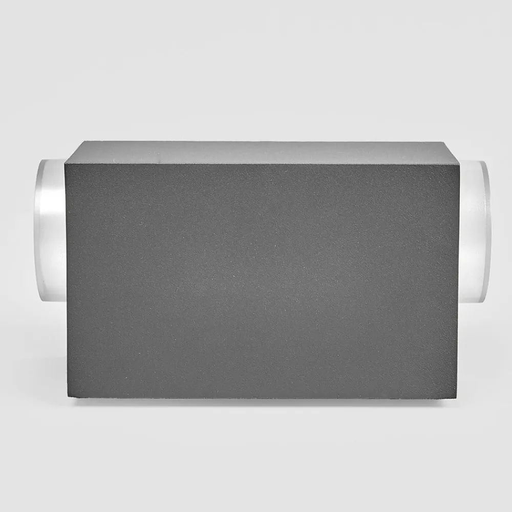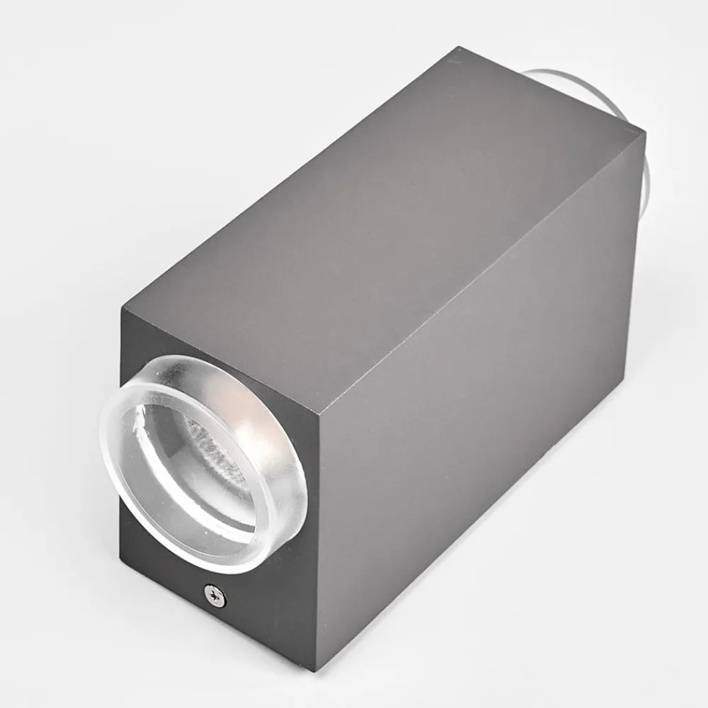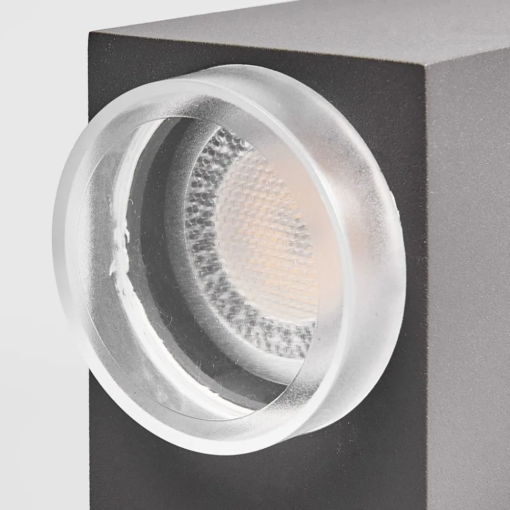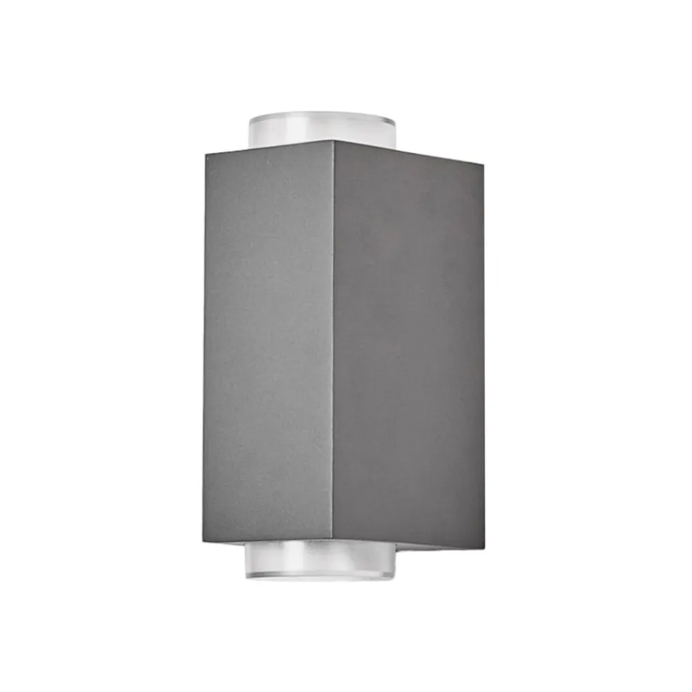 Denne udendørsvæglampe har en tosidet lysudgang, idet en GU10-pærer rettes opad og den anden nedad. Lampelegemet er fremstillet af aluminium, som er lakeret mørkegråt. Over pærens fatning sider der afdækninger af kunststof, som harmonisk supplerer det samlede design.