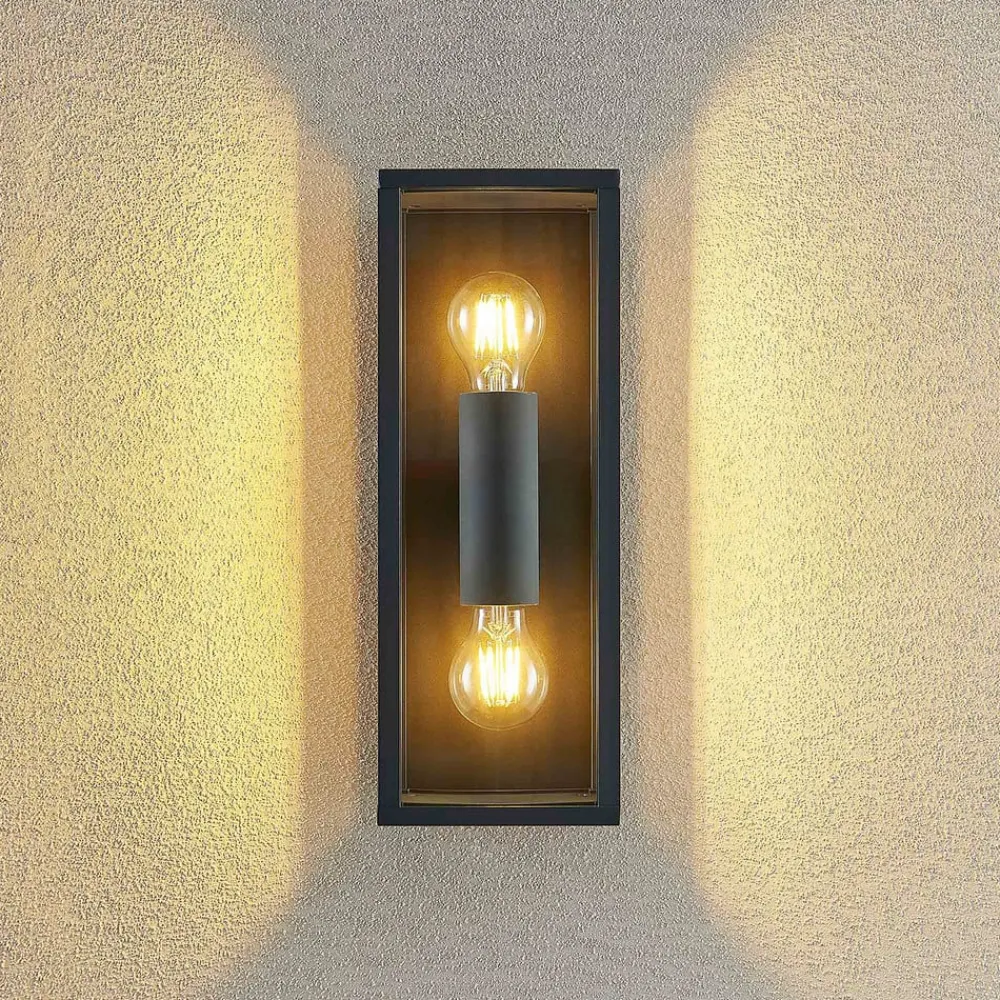 Mørk Peldar udendørs væglampe med to E27-fatninger Peldar udendørs væglampe imponerer med sit særlige design. Huset er lavet af aluminium og har en mørkegrå finish, som får den til at skille sig ud fra omgivelserne. Lampeskærmen er lavet af glas, så de to lyskilder er tydeligt synlige fra alle sider. Fatningerne er rettet opad og nedad, hvilket giver armaturet en interessant karakter. Brugeren kan selv vælge, hvilke lyskilder der skal bruges, men dekorative lamper anbefales for at understrege armaturets udseende.