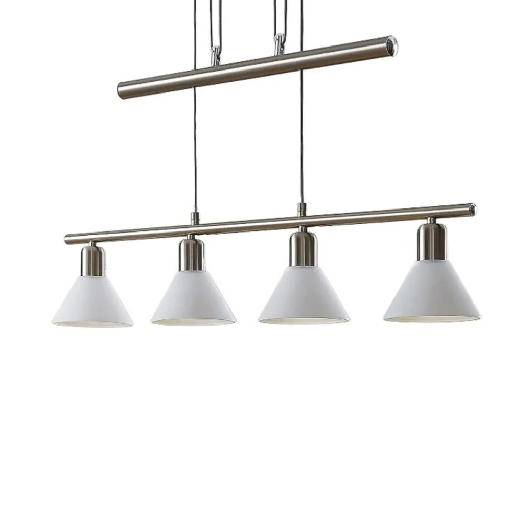 Delira højdejusterbar pendellampe i bjælkeform med fire hvide skærme og en ramme i satineret nikkel Delira-pendellampen er designet til brug over et bord eller en disk og har en langstrakt bjælkeform og en integreret mekanisme til at justere højden med et par enkle trin. Rammen er i en moderne udseende nikkelfarve med satinfinish, og skærmene er helt hvide og lavet af glas, hvilket skaber en smuk, hyggelig lyseffekt, når hængelampen er i brug.