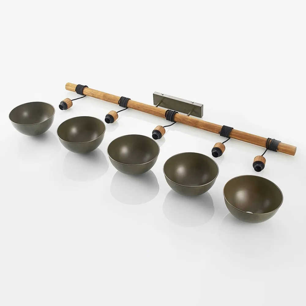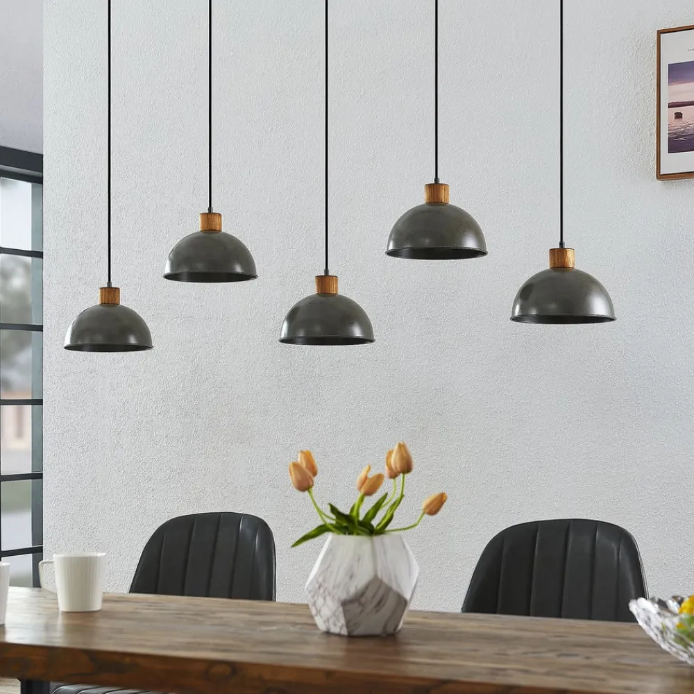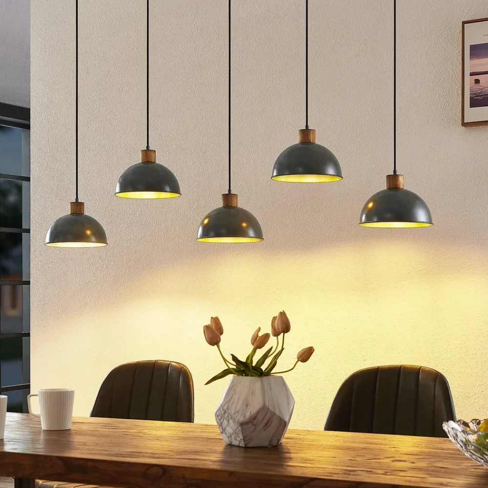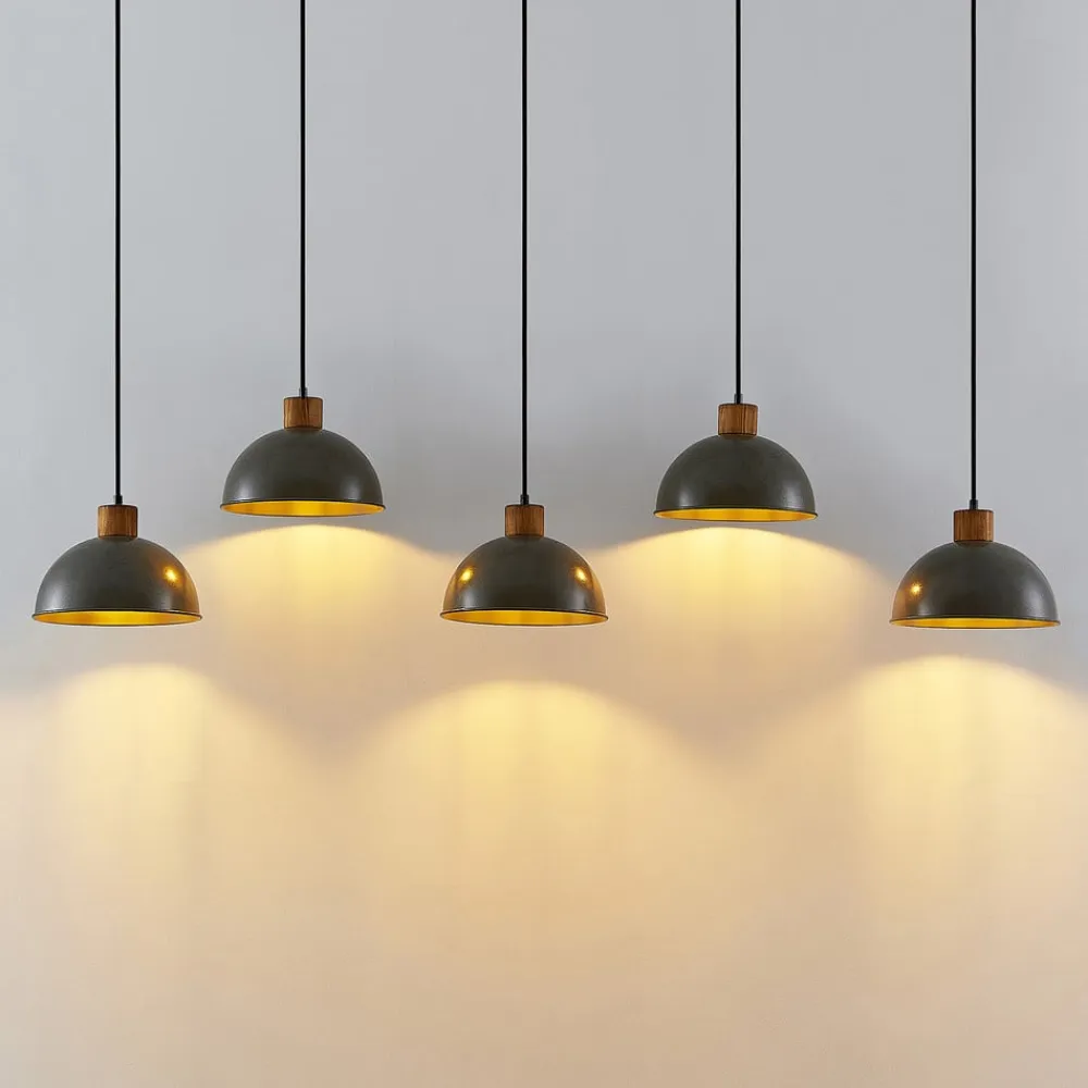 Durbis hængelampe med fem håndfarvede metalskærme Durbis hængelampen er udstyret med fem metalskærme med en håndfarvet finish. Ophænget i hver enkelt skærm kan justeres ved at vikle det lange, tekstilbeklædte kabel rundt om fyrretræsskærmen mere eller mindre ofte. Durbis-pendlen passer til alle typer pærer med E27-sokkel og er et effektivt, fleksibelt og alsidigt armatur, som er særligt velegnet til at oplyse et langbord.