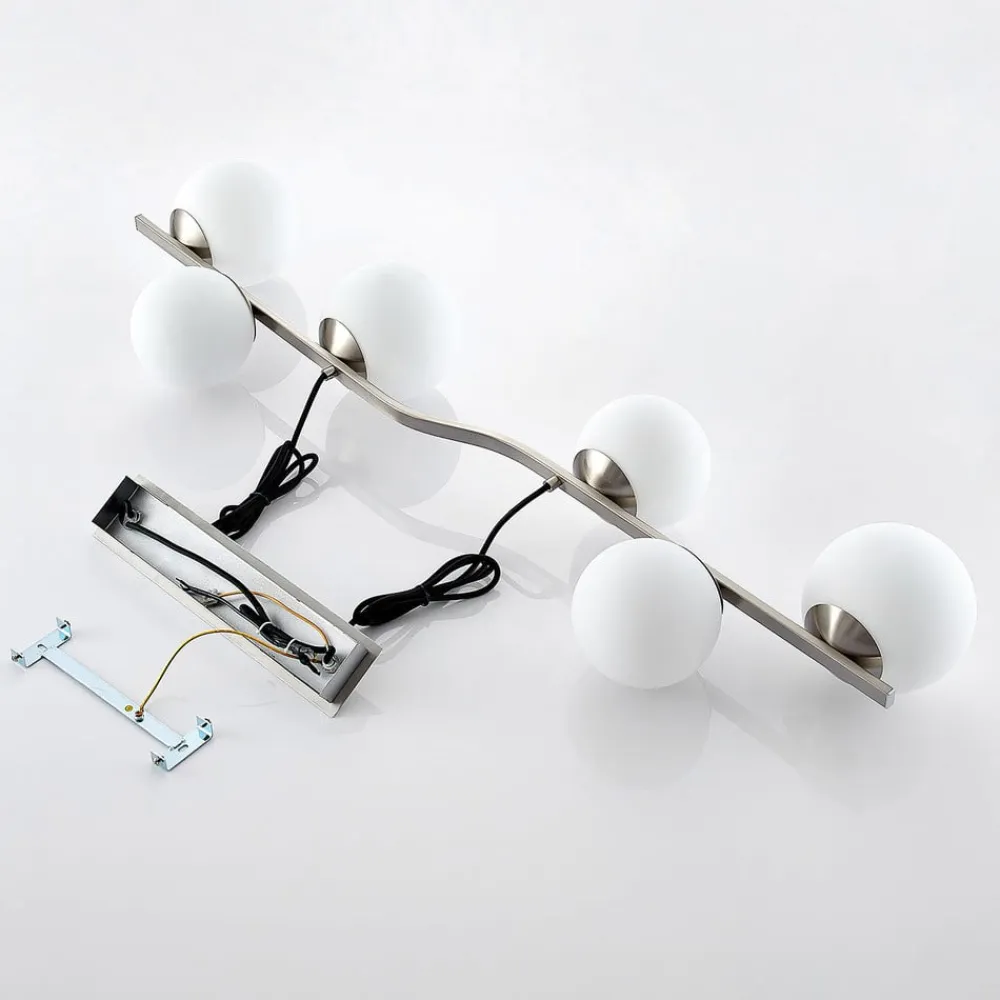 6 lyskilder Avalyn hængelampe til spisestuen med hvide glaskugler i to forskellige størrelser Avalyn er en meget tiltalende lyskilde til spiseområdet, som giver en god stemningsbelysning til spisebordet takket være de seks glaskugler. Den opalhvide overflade er også den bedste garanti for et blødt, hyggeligt lys, da der ikke er nogen blænding. Stellet er let bølget, og de seks kugleformede glasskærme er fastgjort til stellet i to forskellige størrelser. Ideel til moderne indretning!