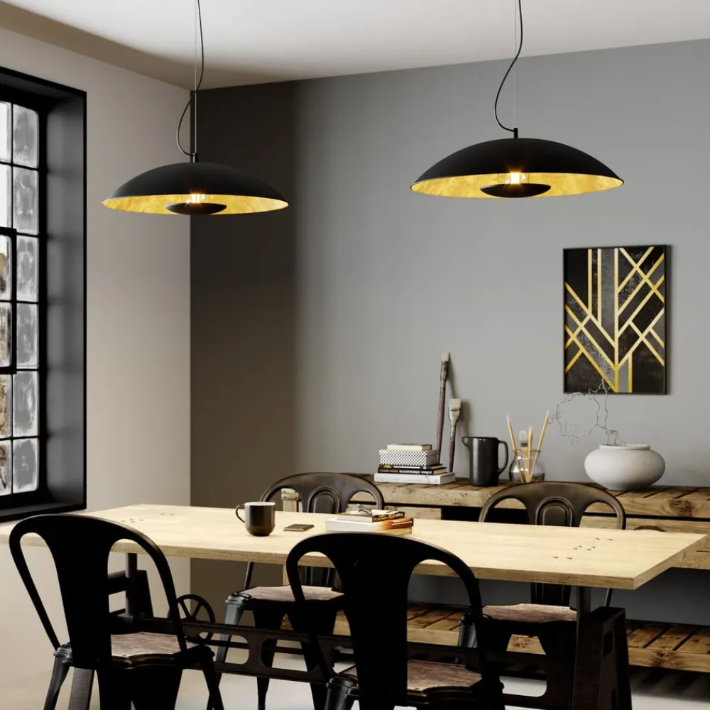 Sort og guld Emilienne pendellampe med rund metalskærm og indirekte lysudsendelse for en særlig hyggelig atmosfære Metalskærmens runde form ser meget elegant ud, hvilket yderligere forstærkes af, at skærmen har en mat guldfinish på indersiden, så pendellampen udsender et dybt varmt lys. Pendellampens hyggelige effekt forstærkes af, at Emilienne har en skærm direkte over pæren, som kun tillader indirekte lysudsendelse og derfor skaber et blødt, flydende lys uden blænding. Hvis f.eks. et spisebord skal belyses på en rigtig hyggelig måde, så er denne pendellampe helt sikkert et belysningselement, der bør komme på shortlisten.