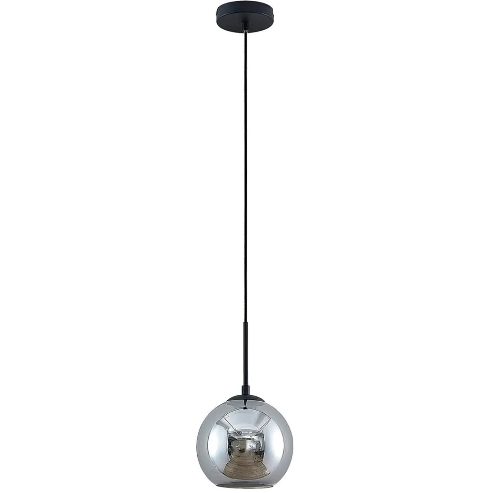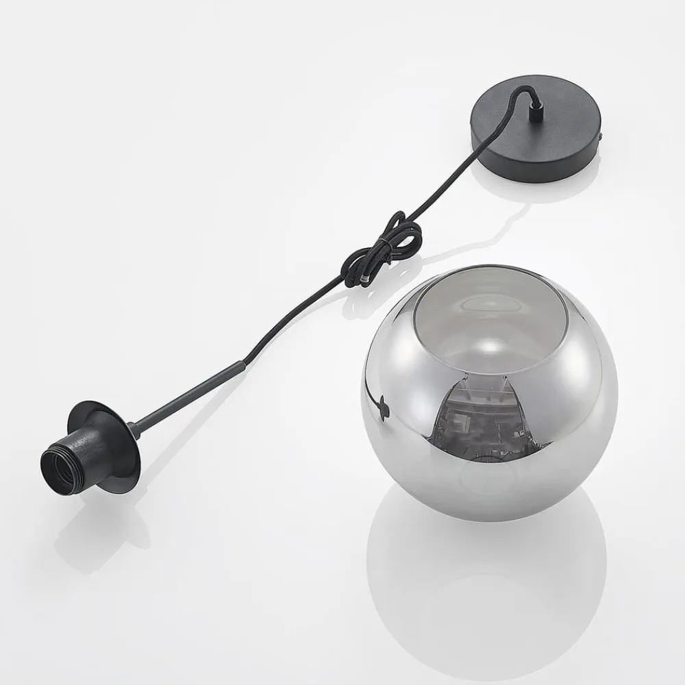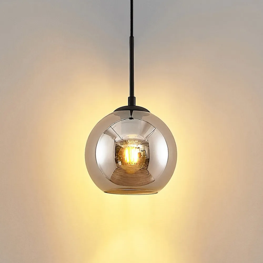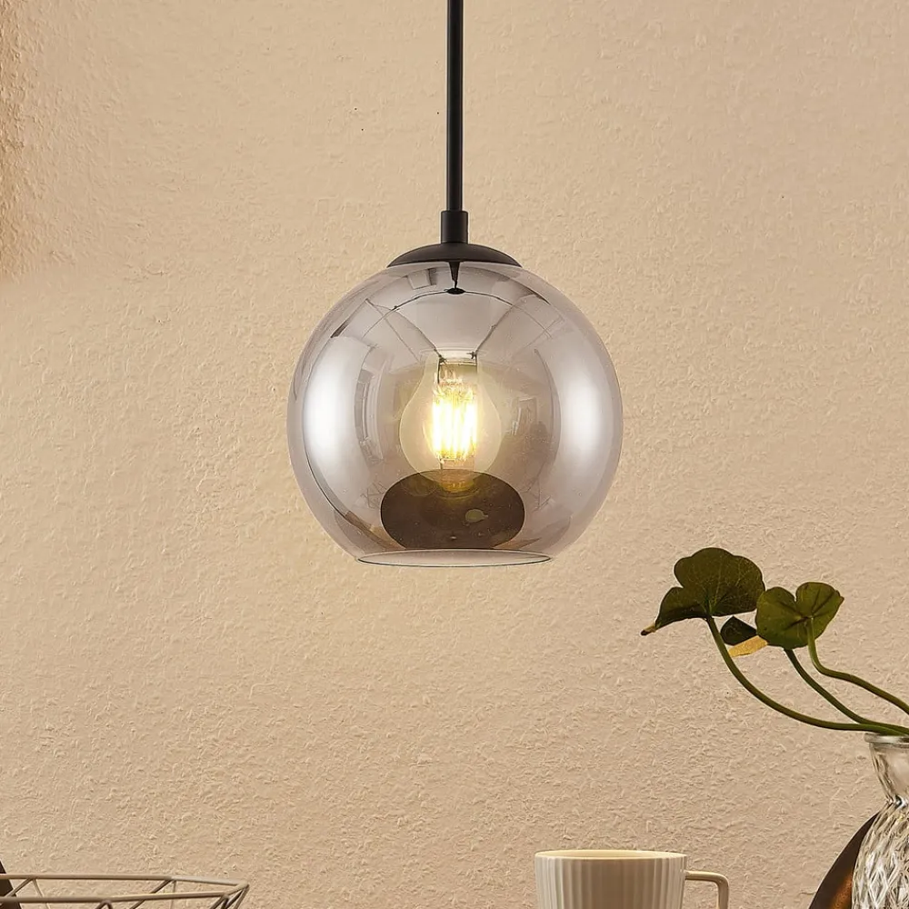 Sfærisk Jurian glaspendel med røget glasskærm og sorte detaljer Jurian imponerer med sit stilfulde look og er en pendel, hvor fokus primært er på skærmen af glas med en røget grå overflade. Den har et sofistikeret, ophøjet udseende og ligner en kugle med kun en lille åbning på undersiden til at skifte lyskilde. Lyset er varmt og hyggeligt, og lyskilden kan stadig ses tydeligt udefra, så den skal vælges med omhu som en del af helheden og helst have en dekorativ glaspære, som det f.eks. er tilfældet med effektive LED-pærer. Pendellampen ser også godt ud i en række over en disk og giver en stemningsfuld belysning med høj hyggefaktor.