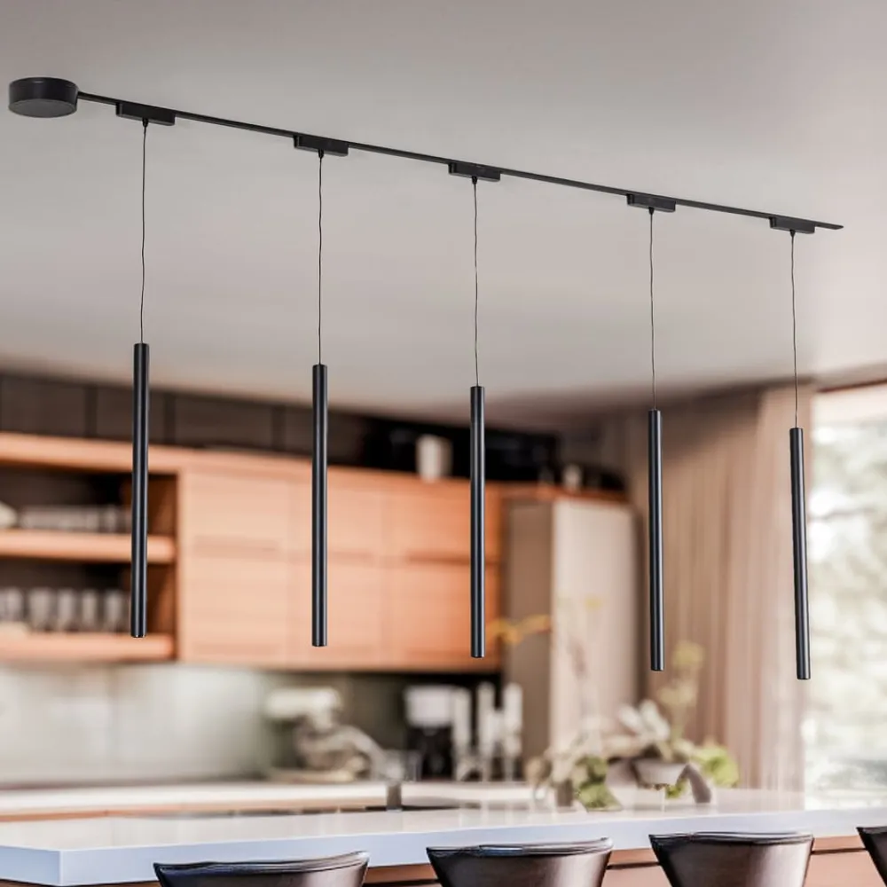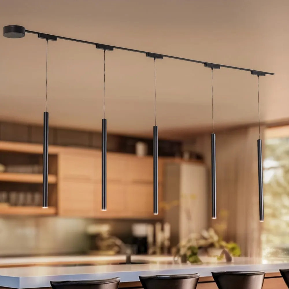Det leveres med fem pendellamper, som kan dæmpes og har en regulerbar lysfarve (CCT), så der altid er den rigtige lysstyrke. Med den medfølgende fjernbetjening kan både dæmper- og CCT-funktionen styres, hvilket giver mulighed for fleksibel lysstyrke og en lysfarve mellem varmhvid (2.700 K) og dagslys (6.000 K). Lumaro skinnesystemet er desuden meget fleksibelt, da armaturernes placering langs skinnerne kan ændres når som helst. Der er også mulighed for at udvide skinnesystemet med yderligere skinner og lyselementer og dermed få adgang til utallige designvariationer og maksimal fleksibilitet.