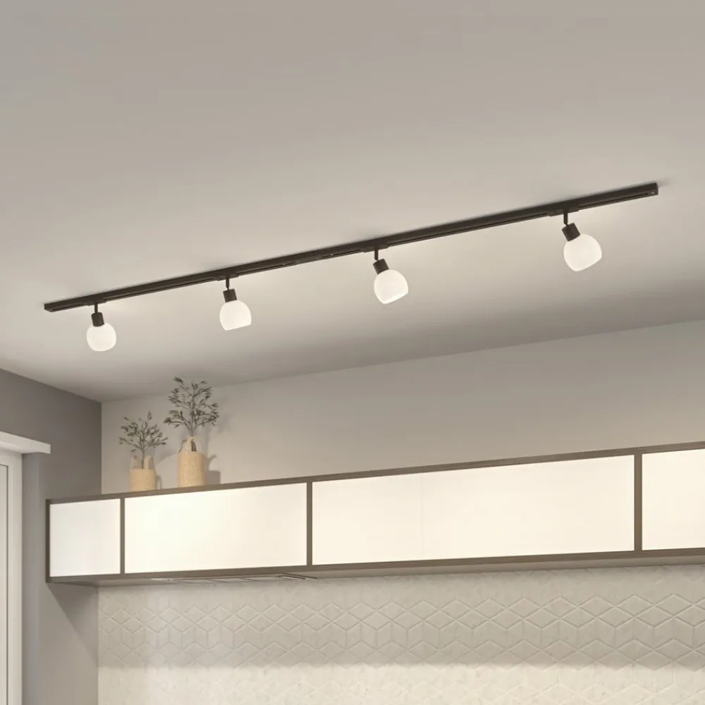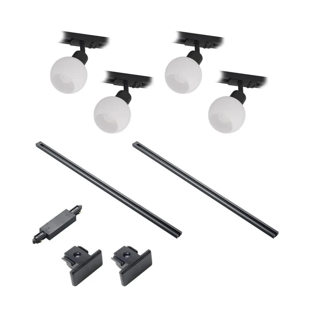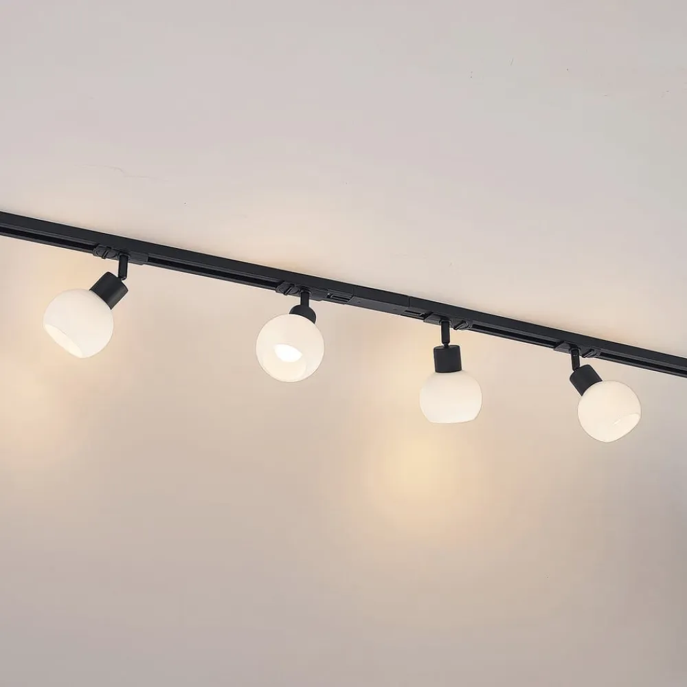 4 lyskilder Linaro 1-fase skinne i sort Denne skinne er udstyret med fire bevægelige spots, der har en attraktiv kugleformet glasskærm, mens rammen og skinnen er udført i sort. Det opalhvide glas skaber et behageligt lys, der er velegnet til mange steder i boligen. 2 x 1 m lang skinne, en centerfeeder, to endestykker og fire spots leveres sammen med denne 1-fase skinne.