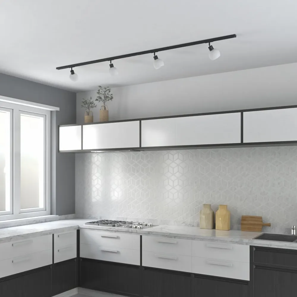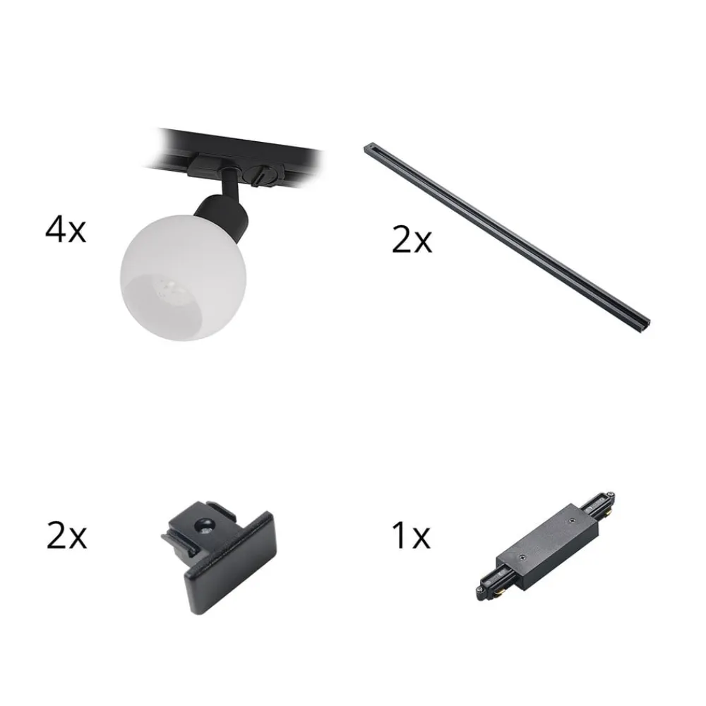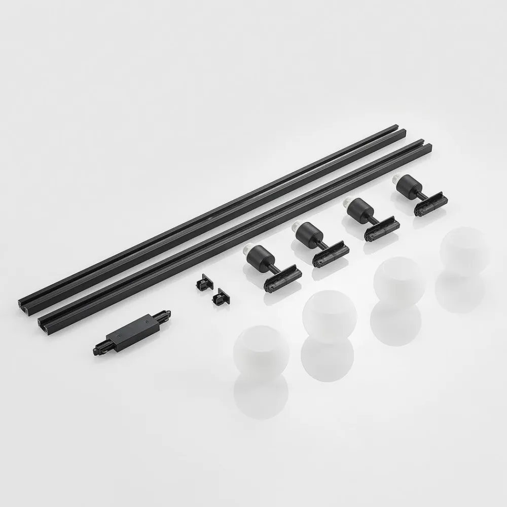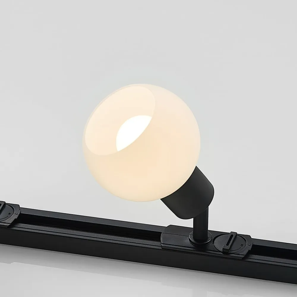4 lyskilder Linaro 1-fase skinne i sort Denne skinne er udstyret med fire bevægelige spots, der har en attraktiv kugleformet glasskærm, mens rammen og skinnen er udført i sort. Det opalhvide glas skaber et behageligt lys, der er velegnet til mange steder i boligen. 2 x 1 m lang skinne, en centerfeeder, to endestykker og fire spots leveres sammen med denne 1-fase skinne.