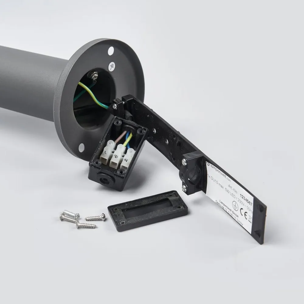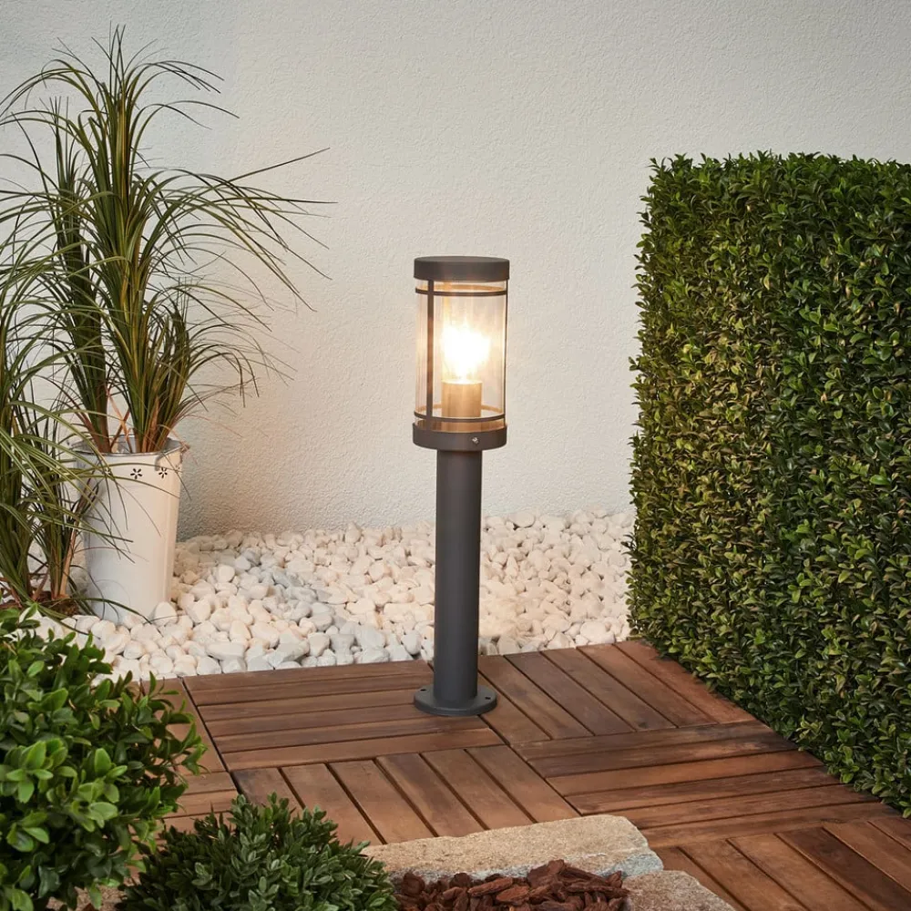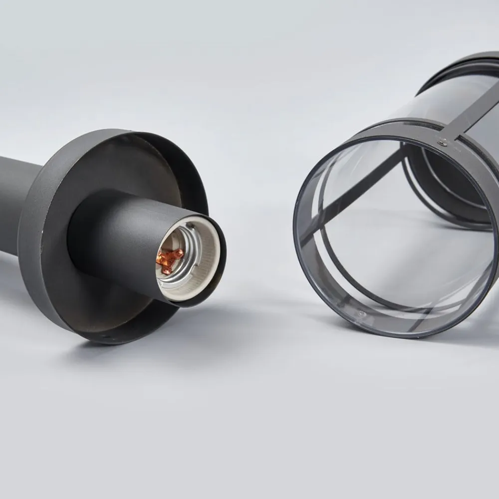 Denne sokkelampe kan godt placeres på mindre forhøjninger udendørs, for eksempel en mur. Så kommer Djori rigtig godt til sin ret og bliver en velkommen og nyttig lyskilde. Den nederste del består af et smalt metalrør, og ovenpå sidder den cylindriske skærm med klar indsats i polycarbonat. Den klare overflade sikrer, at hele lyset kommer ud, og at intet af lampens lysstyrke går tabt. Det mørkegrå finish passer meget godt til moderne haver og indkørsler.