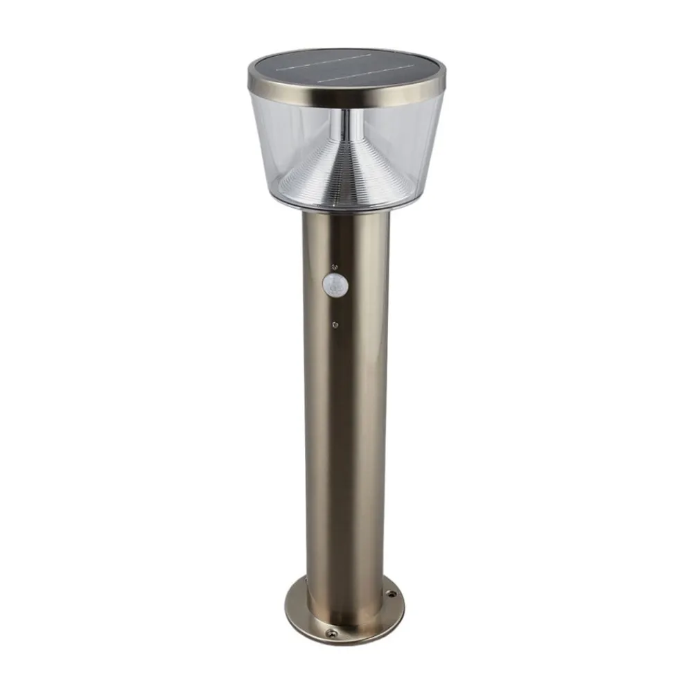 Antje LED-sokkellampe i rustfrit stål med bevægelsessensorfunktion Antje fungerer godt udendørs og har øget funktionalitet takket være bevægelsessensoren og solteknologien. Solpanelet på toppen af lampehovedet fanger solens stråler i løbet af dagen og omdanner deres energi til elektricitet, som så er tilgængelig for LED-belysningen efter mørkets frembrud. Det betyder, at der ikke kræves nogen strømtilslutning til udendørsbelysningen, og at du er relativt uafhængig, når du installerer LED-sokkellampen. Tilstedeværelsesdetektoren sørger for, at lysstyrken øges til fuld styrke, når nogen går forbi lampen og har brug for dens lys. Ellers har den en grundlysstyrke på 75 lumen om natten for at give et behageligt orienteringslys. Lysets varighed ved fuld lysstyrke er ca. 25 sekunder, registreringsvinklen er 90 grader, og rækkevidden er 2 til 6 meter. LED-sokkellampen har et moderne udseende med sit design i rustfrit stål. Lyset fra LED’erne er rettet nedad, hvor det rammer den reflekterende overflade på en reflektorpære og forstærkes i sin effekt.
