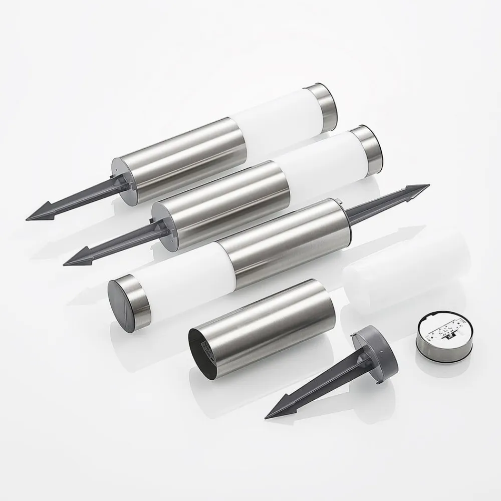 Sirita LED-solcellelamper i et praktisk sæt med fire, til haver, terrasser og indkørsler Sirita kan placeres i en række udendørs områder uden behov for elektricitet. Alt, hvad du behøver, er sollys i løbet af dagen for at oplade solpanelet. LED-solcellelampen fås her som et sæt med fire, så store områder af terrasser, haver og indkørsler kan oplyses. Lyset forankres sikkert i jorden ved hjælp af et jordspyd og holdes derefter godt på plads. Lygtehuset er lavet af rustfrit stål i en cylindrisk form, og hvid plast giver en blød lysfordeling. Lygten kan betjenes i enten høj eller lav tilstand, hvilket ikke kun påvirker lysstyrken, men også LED’ernes lystid, som enten kan lyse i op til 18 timer eller op til 30 timer i det lavere lysniveau, hvis batteriet er fuldt opladet på forhånd.