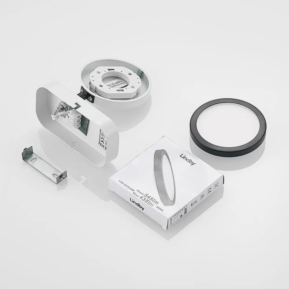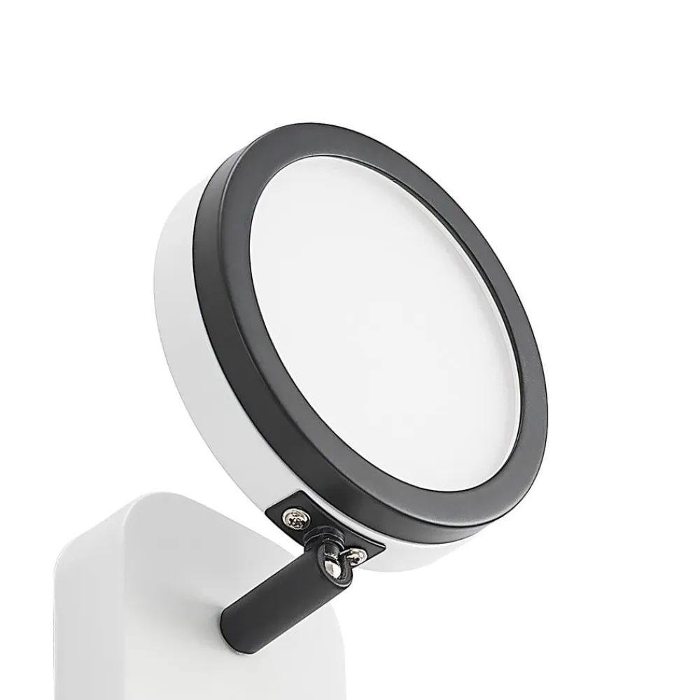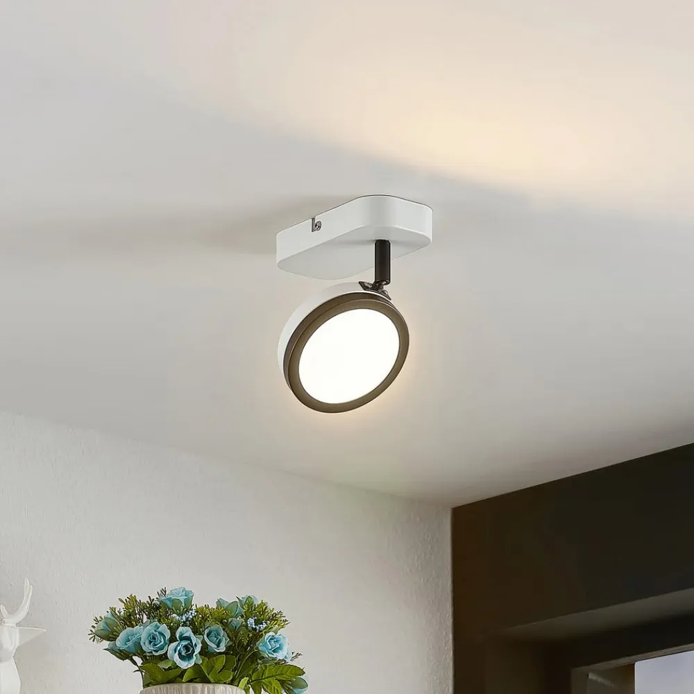 Vesim spotlight med fleksibel lyskilde Vesim er en tidløs lyskilde, som kan monteres både i loftet og på væggen. Det slanke armaturhus er lavet af jern og har en hvid finish. Det runde armaturhoved har også en sort ring for at fuldende looket. Denne spotlight har en GX53-fatning og kan drejes og vippes efter behov for at tilpasse lysudsendelsen til dine egne behov.