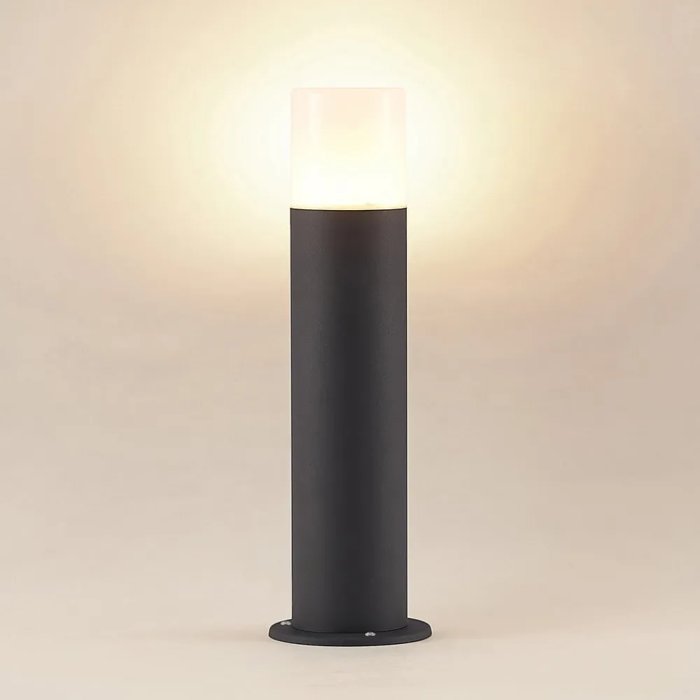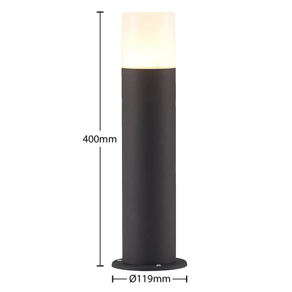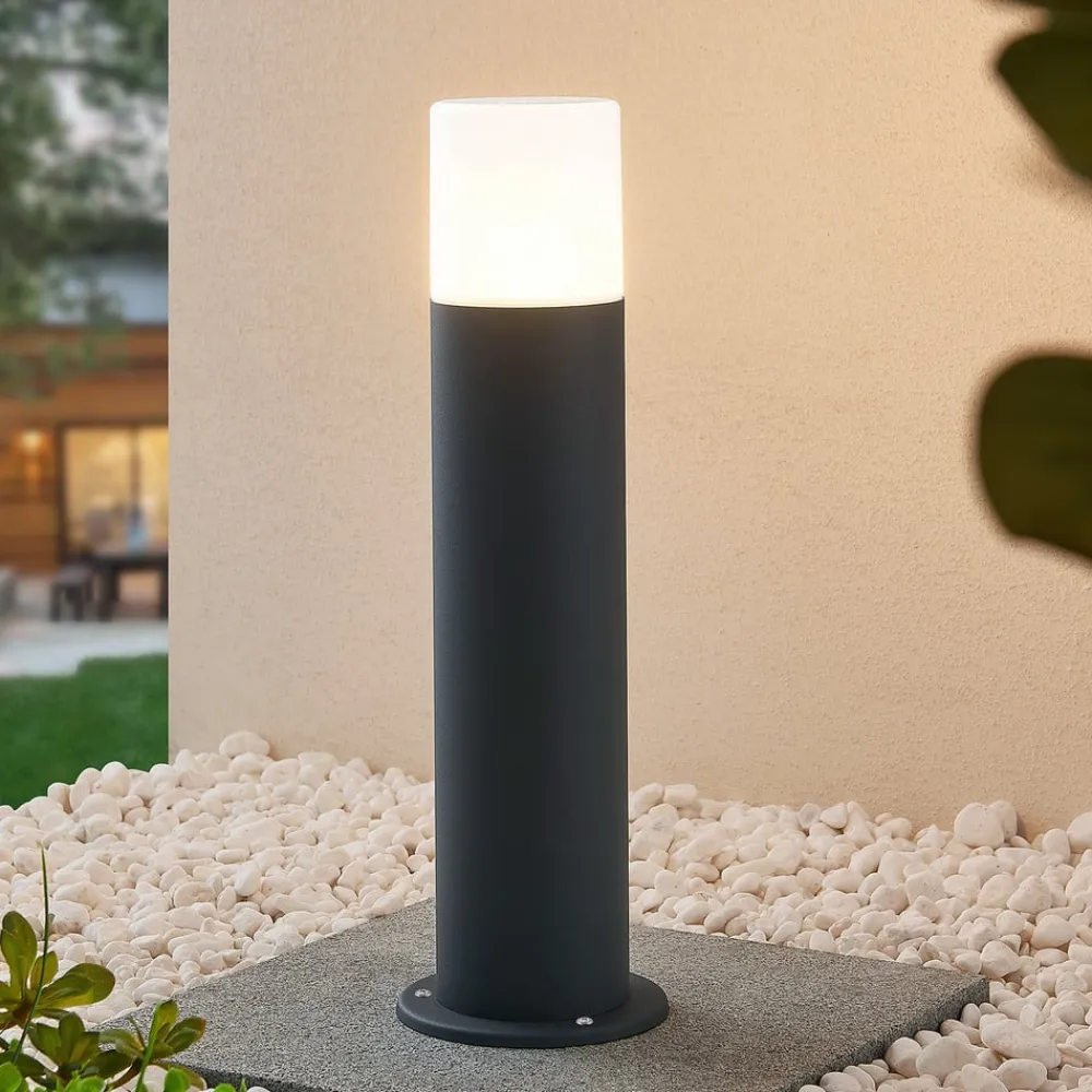 Sokkellampen Tabyn imponerer med sit elegante design Sokkellampen Tabyn er en moderne lyskilde til haven og terrassen. Den er særlig effektiv, når den installeres i en række med flere lamper fra samme serie. Tabyn har en E27-fatning, som brugeren kan montere efter ønske. Takket være den opalhvide lampeskærm af plast udsendes lyset homogent og blødt i alle retninger. Takket være kapslingsgraden IP44 kan denne lampe modstå vind og vejr uden problemer.