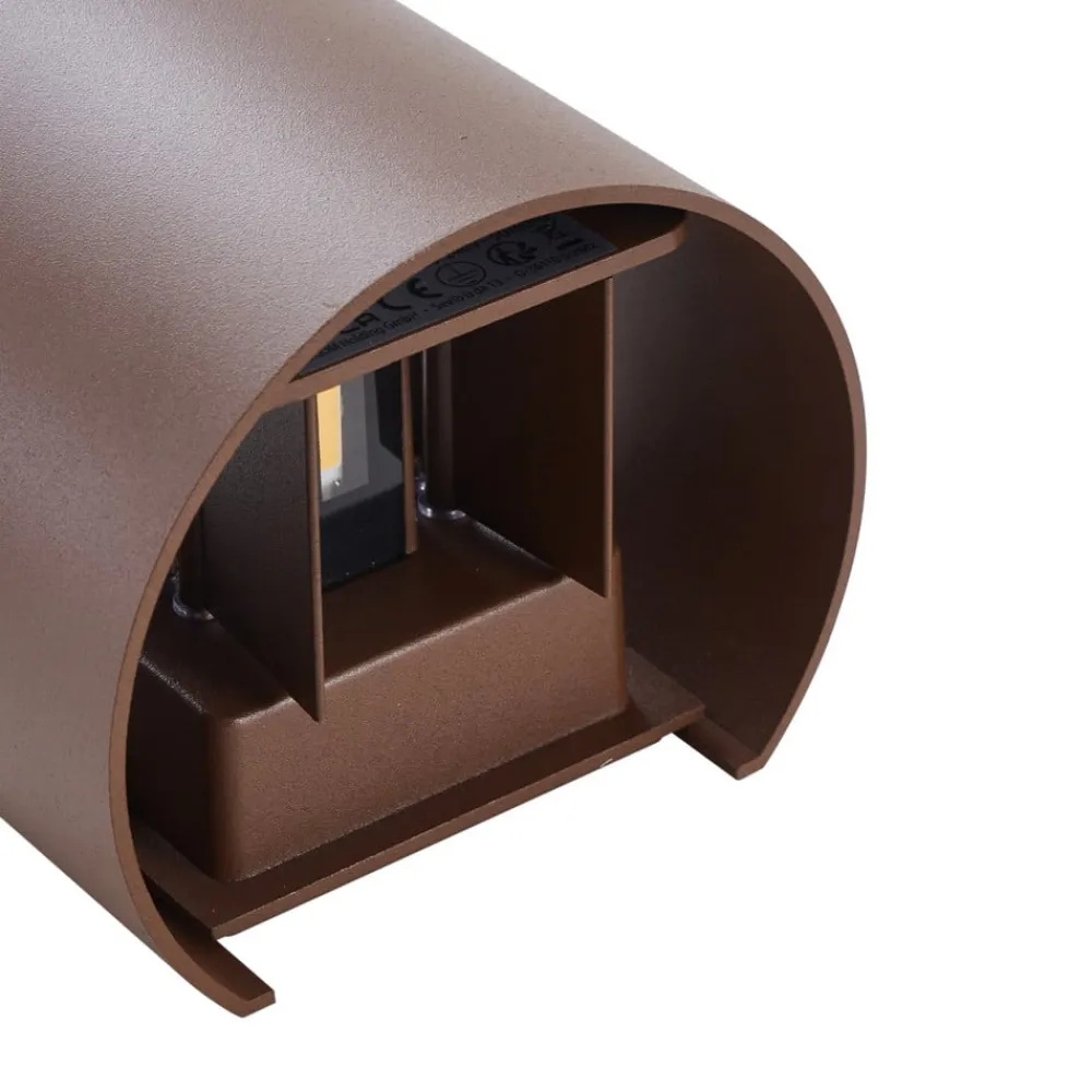 Brun udendørs LED-væglampe Nivar af metal med et afrundet look Denne udendørslampe oplyser dit udendørs område og er også en attraktiv tilføjelse takket være sin flotte overordnede æstetik. Den varmhvide lysfarve bader din forhave, gårdsplads eller indkørsel i en fantastisk flair. Takket være kapslingsgraden IP54 er væglampen beskyttet mod støv og vandsprøjt. Den fuldender effektivt belysningskonceptet i ethvert udendørs område med sit attraktive udseende. Lampen giver et smukt udtryk med én lyskilde. Med sit smukke design passer denne flotte lampe perfekt ind i dine udendørs møbler og skaber en behagelig atmosfære. Den udendørs væglampe i moderne stil er færdig i brun. Metallampen vil give dig en masse glæde og kan med succes integreres i en lang række udendørs områder. Uanset hvor du tilslutter den, garanterer denne udendørslampe en hyggelig atmosfære overalt, hvor du altid kan føle dig helt godt tilpas – Strålevinkel justerbar fra 1-120°