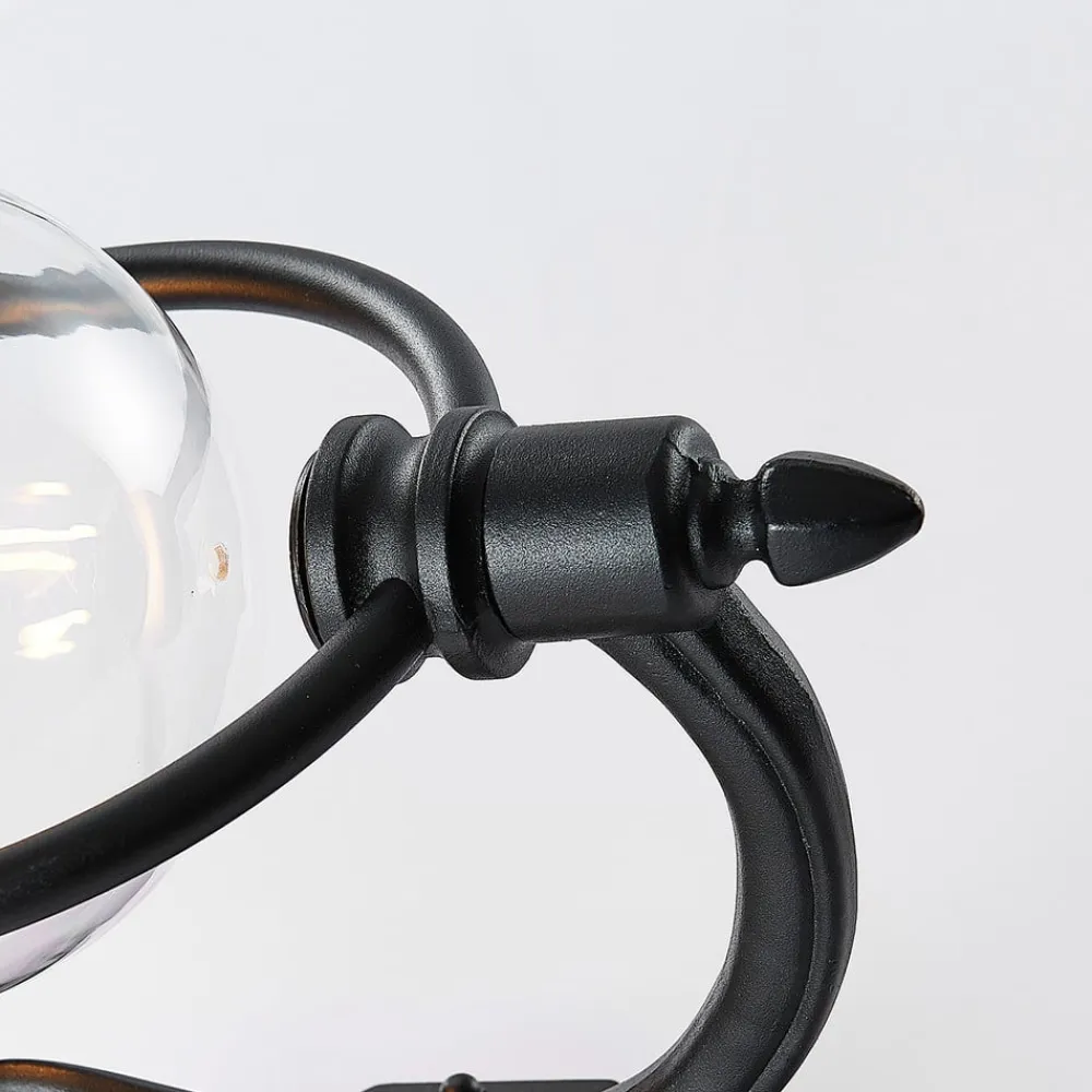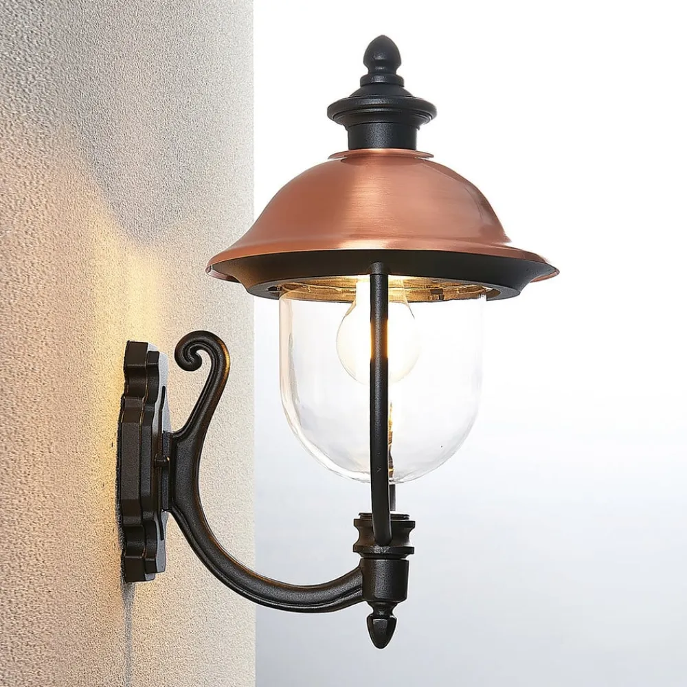 Den formskønne udendørs væglampe Clint består af et sort stel i aluminium, som kontrastfuldt suppleres med en kobberdel. Lampeskærmen ligner en stående lanterne, der er udstyret med et tag af kobber og en gennemsigtig skærm over E27-fatningen.