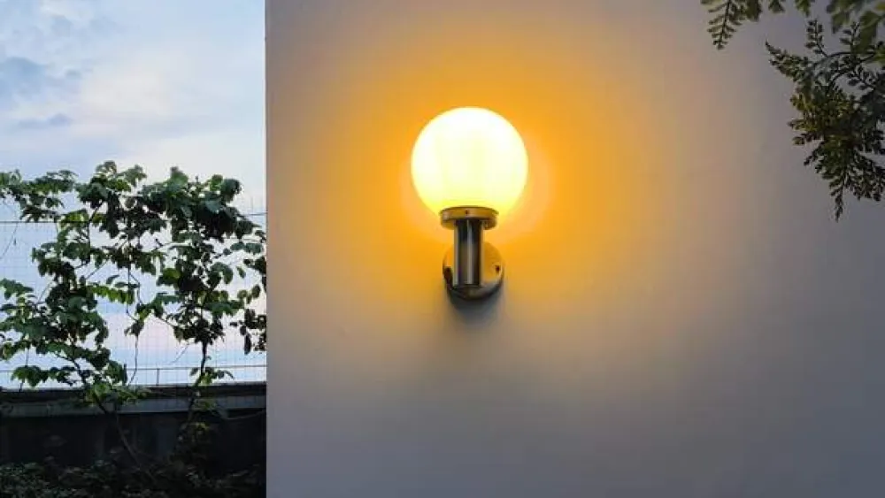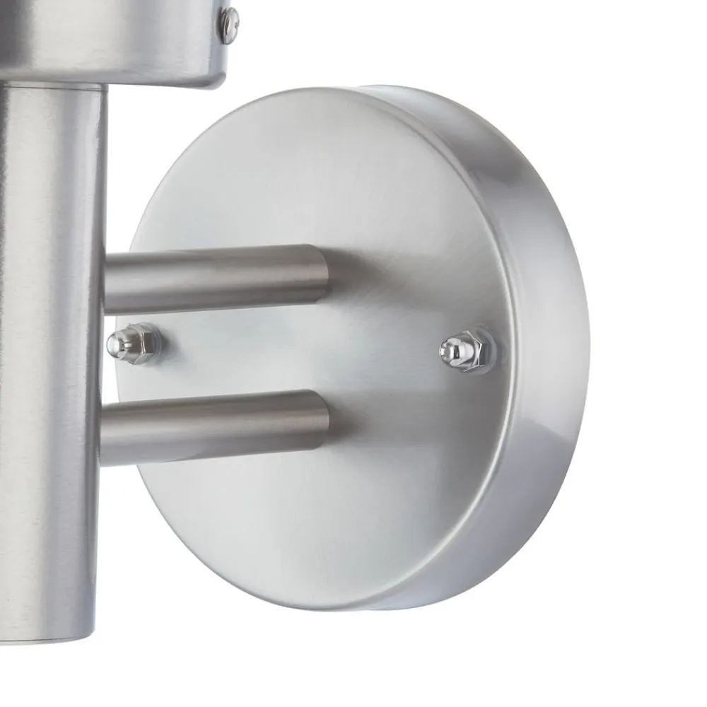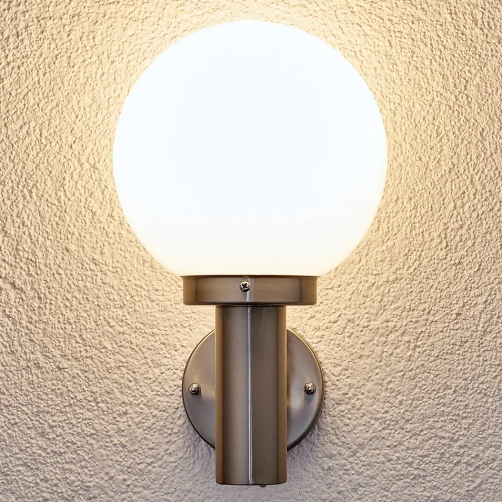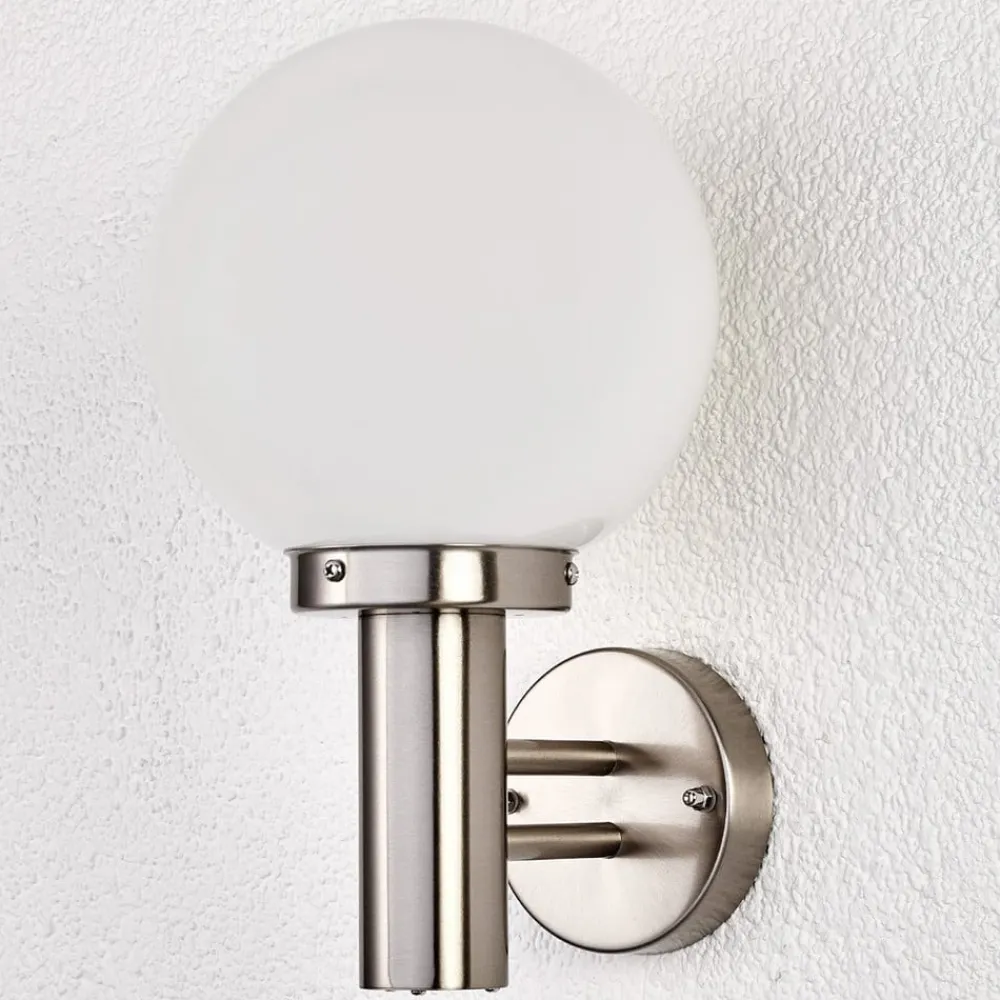 Nada har en opal hvid skærm i kugleformet glas og et stel i rustfrit stål. Den består af en rund vægbeslag og to smalle stivere, der peger mod den forreste del af stellet. Her munder det rustfri stålstelt ud i glaskuglen, der omslutter E27-pæren. Den opalhvide overflade giver en særlig blød lysfordeling, og den udendørs væglampe passer ikke kun til et moderne miljø, men ser også meget stilfuld ud, når den kombineres med et mere klassisk miljø.