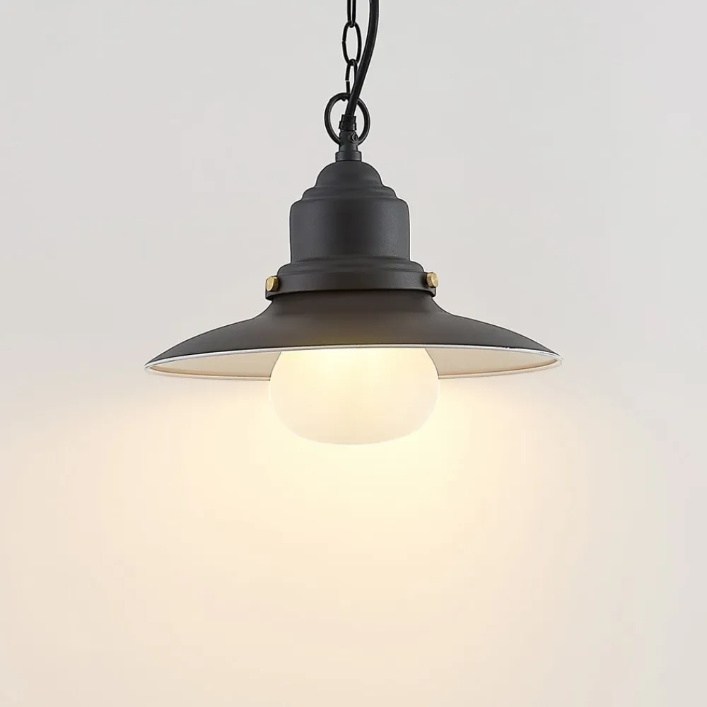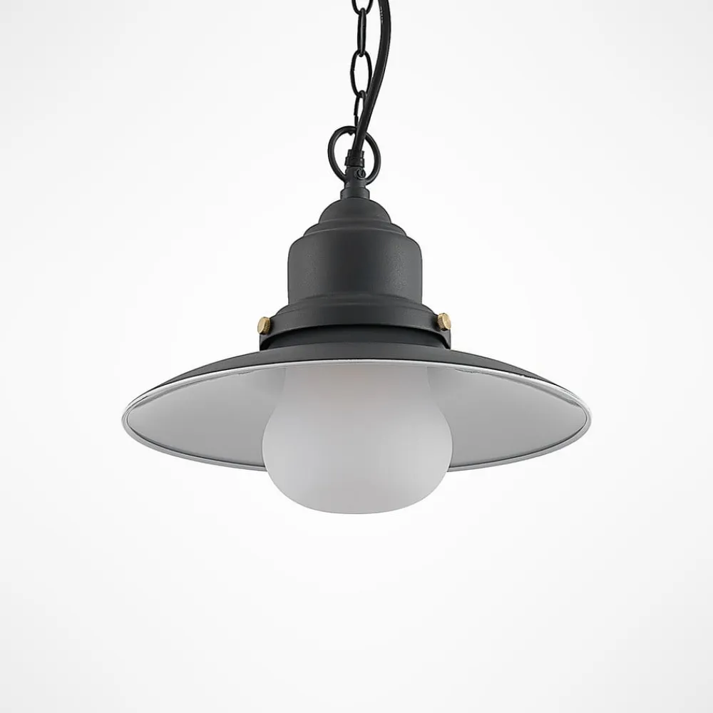 Roisin udendørs hængelampe i mørkegråt stål Roisin udendørs hængelampe har et slående design i mørkegråt stål. En hvid glasskærm hænger fra den rustikke lampeskærm i stil med en fiskerlampe og omgiver den pære, der skal bruges. Her kan vælges en E27-pære, som genererer blændfri belysning gennem lampeskærmen. Takket være kapslingsgraden IP44 er lampen beskyttet mod vandsprøjt og er derfor perfekt til installation på en overdækket terrasse. Den udendørs hængelampe Roisin hænger i et slankt ophæng, så den også kan installeres på mindre terrasser uden at optage for meget plads. Det industrielle look sætter markante accenter i husets arkitektoniske stil. Den tiltrækker nysgerrige blikke og gør ethvert udendørs område til noget helt særligt.