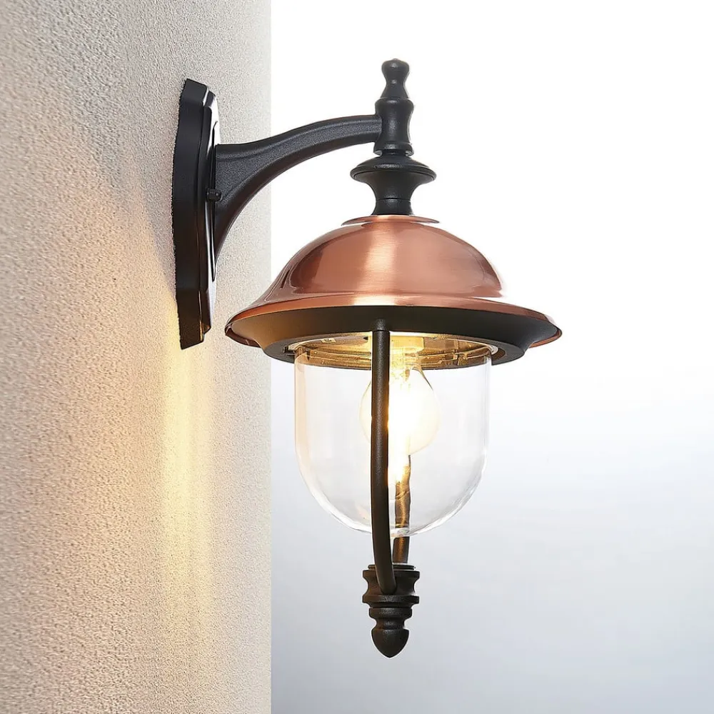 Takket være de anvendte materialer kan den formskønne udendørs væglampe Clint også bruges i nærheden af søer. Det sorte stel er lavet af aluminium, og den gennemsigtige lampeskærm er lavet af robust plast. Derudover har den et tag af kobber, som ikke kun skaber en smuk kontrast, men også bidrager til vejrbestandigheden. Udendørslampe Clint er med sit vintage-look helt på højde med tidens trend og overbeviser med sin smukke lanterneform. Anvendt ved indgangspartier, terrasser eller verandaer giver Clint-lampen ikke kun pålidelig og sikker belysning om aftenen, men pynter også smukt og imponerende i alle områder, selv i dagslys.