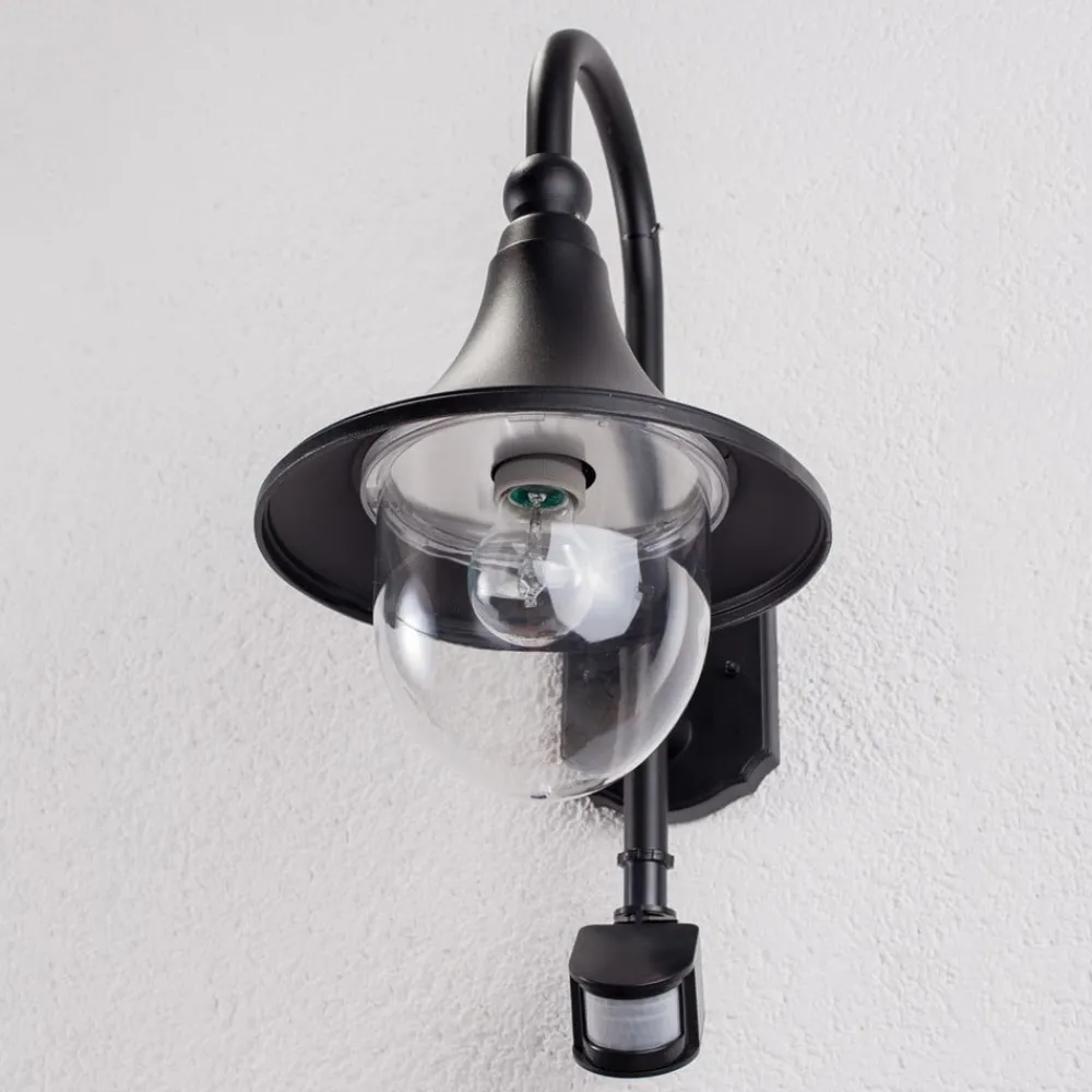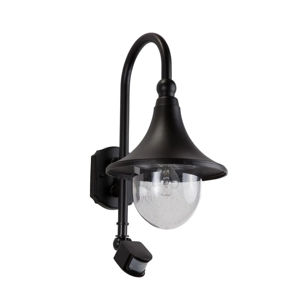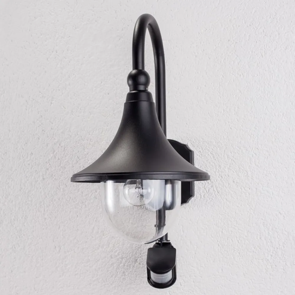 Elegant udendørs væglampe Daphne med bevægelsessensor Den udendørs væglampe Daphne er lavet af sortlakeret metal, som strækker sig fra vægbeslaget i en buet form og ender i et klokkeformet element. En plastkuppel med en klar overflade sidder på undersiden over pæren. Dette giver tilstrækkelig beskyttelse af pæren, men intet af lampens lysstyrke går tabt. Den udendørs væglampe leveres med en sensor for øget funktionalitet. På den måde tændes lampen kun, når den registrerer bevægelse, så man undgår unødvendig søgen efter kontakten og for lang brændetid for pæren. Sensorens rækkevidde er 6 til 21 meter (kan indstilles i tre trin), registreringsvinklen er 180°. Lysets varighed kan indstilles fra 1 minut til 3 minutter til 8 minutter.
