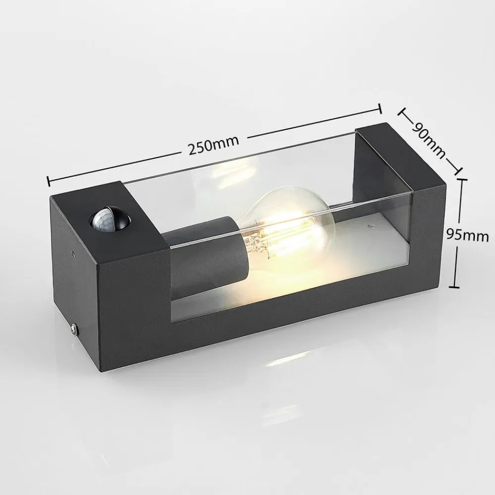 Tilian udendørs væglampe med kantet sensor, E27-fatning og hus i rustfrit stål i mørkegrå Tilian er en robust lyskilde til udendørs brug, der kombinerer et hus i rustfrit stål med en mørkegrå nuance med relativt brudsikre polykarbonatruder. Kapslingsgraden IP44 taler også for at bruge væglampen udendørs. Fra et teknisk synspunkt imponerer armaturet med sin indbyggede bevægelsessensor, som er placeret i den nederste del. Denne lille genstand kan bruges til at sikre, at udendørslampen altid tændes, når der er brug for lyset på stedet, fordi der er mennesker i umiddelbar nærhed. Uønskede personer kan også bedre afskrækkes fra at komme ind i lokalerne med den pludseligt opståede lysstyrke, da de meget hurtigere og stærkere kommer i fokus. Sensordata: – Justerbar lysvarighed (fra ca. 8 sekunder til ca. 8 minutter) – Maksimal rækkevidde for bevægelsessensoren 8 meter – Registreringsvinkel 90 grader
