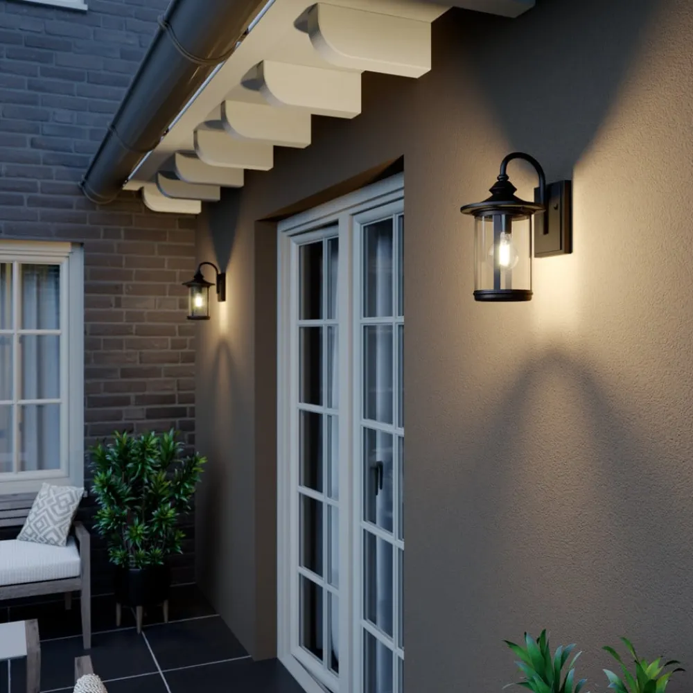 Zayn udendørs væglampe i sort med lampeskærm i glas Den antikt udseende Zayn udendørs væglampe er ideel til belysning af husets indgangsparti eller terrasse. Den dekorativt designede lampekrop er lavet af klart glas med sort aluminium og er formet som en lanterne. Den indvendige E27-fatning er ideel til dekorative eller klare pærer, da det forstærker den nostalgiske effekt. Lyset kan spotlightes hele vejen rundt og giver tilstrækkelig lysstyrke og sikkerhed på udendørsarealer.