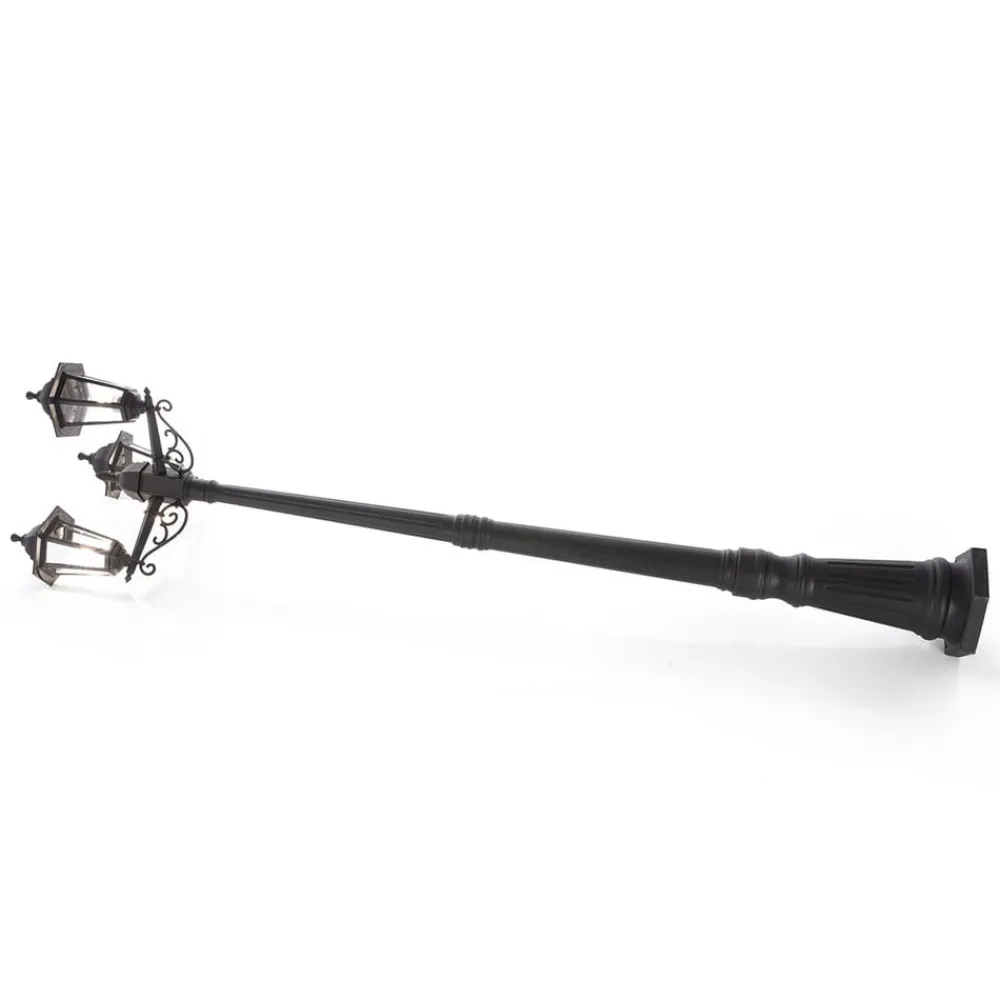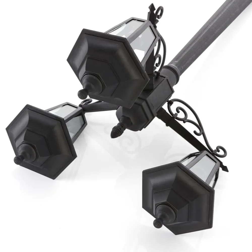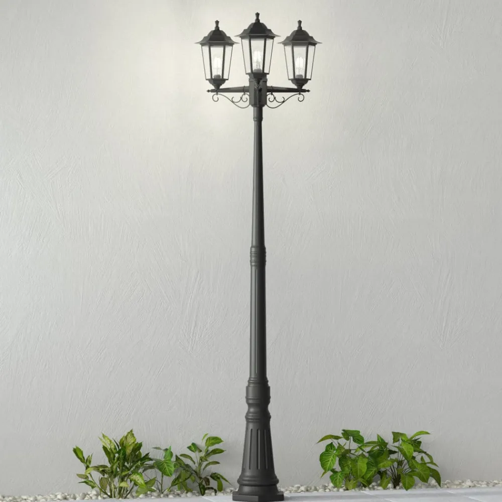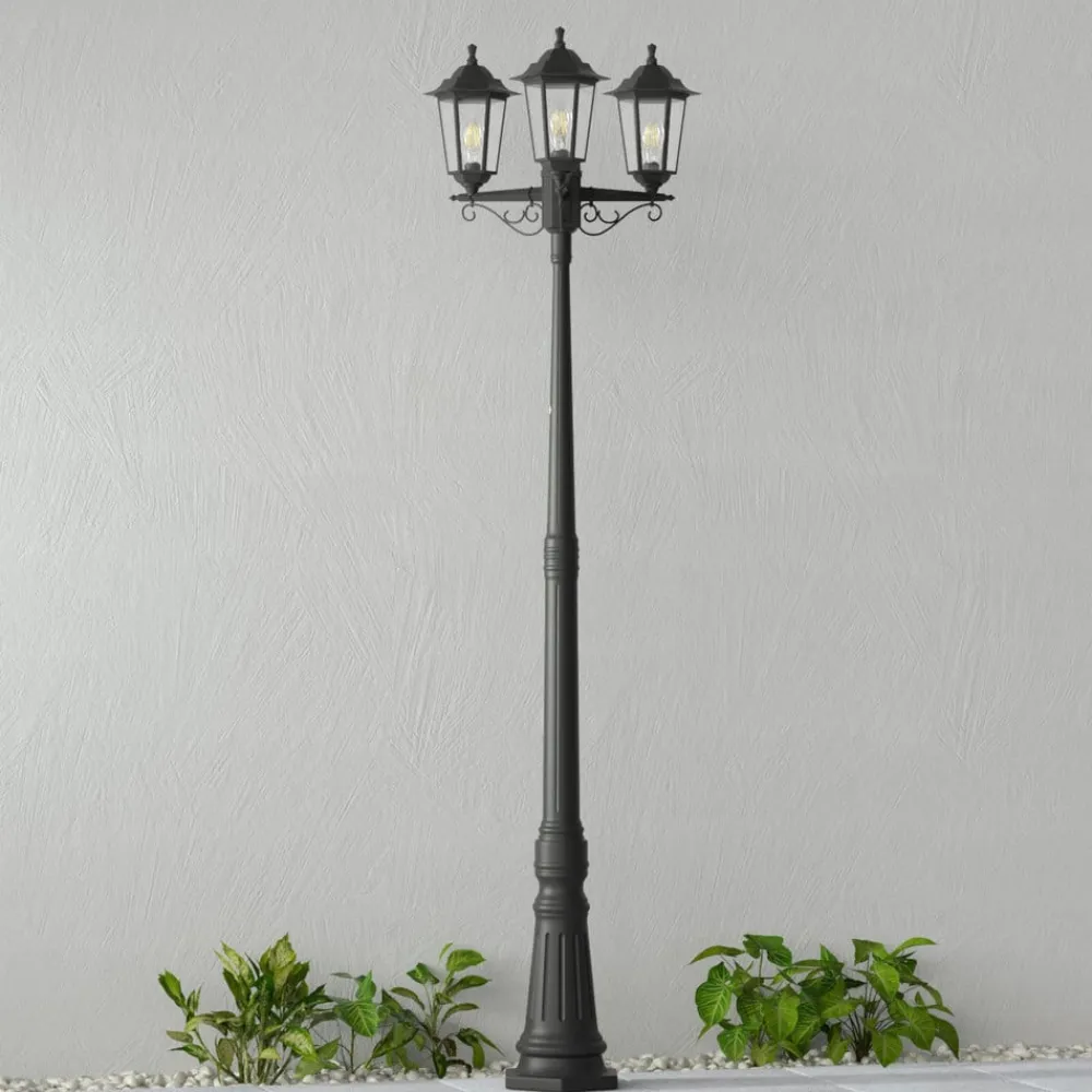 Nane 3 lyskilder i nostalgisk stil Denne lygtepæl er ideel til belysning i store haver og parker. De tre skærme ligner lygter, så du straks kan genkende den nostalgiske charme, der udgår fra udendørslampen. Overfladen på den saltvandsresistente lygtepæl er lavet af plast og har en sort finish, der symboliserer dens alsidige brug i klassiske stilarter. Sideindsatserne er lavet af glas og giver et klart udsyn til pærerne. Pærerne skal derfor vælges med omhu. Energibesparende LED-pærer med glødetrådsteknologi eller et nostalgisk rustikt look kan varmt anbefales. Et ægte HighLight med en særlig charme!