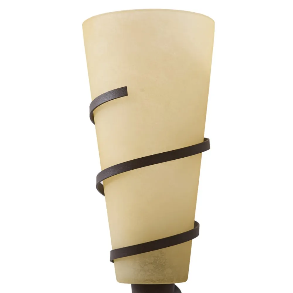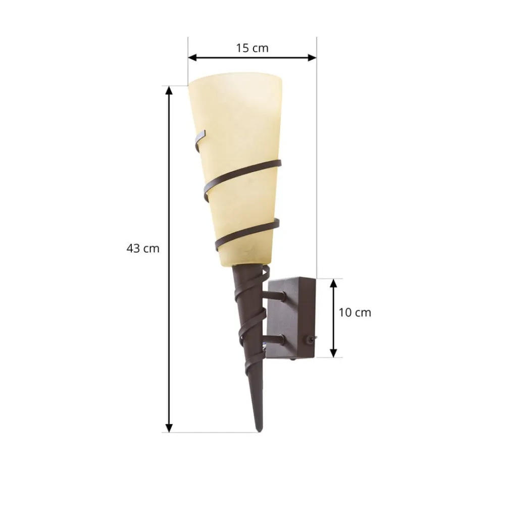 Rustfarvet vægfakkel Anouk med spiralformet dekorativt element Anouk er særlig velegnet til klassisk eller rustikt interiør. Glasskærmen, som bliver bredere mod toppen, giver et blødt, hyggeligt lys, som ikke kun ser godt ud i stuen, men også i gangene. Metalelementerne har en attraktiv rustfarve, som smukt understreger det hyggelige design. På grund af sit design giver vægfaklen også indirekte lys, hvilket i sig selv opfattes som meget indbydende og hyggeligt. Spiralelementet fungerer som en attraktiv dekoration og er ligesom resten af rammen holdt i den tiltalende rustfarve, hvilket øger nostalgifaktoren til fordel for det samlede udseende.