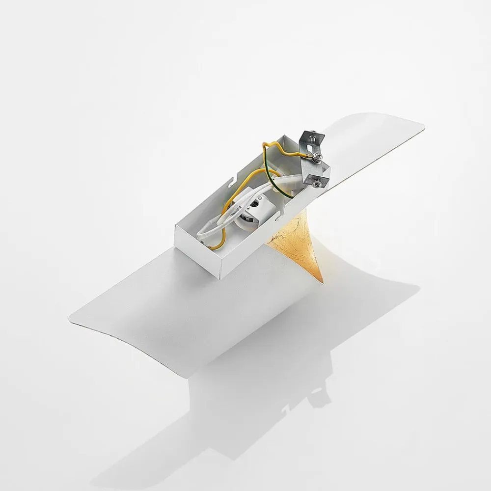 Desirio – elegant væglampe i hvid og guld – ideel til gang og soveværelse Denne væglampe udstråler en særlig elegance med sit legende og dynamiske design, der integrerer farverne hvid og guld og bidrager til en hyggelig accentbelysning i stuen. Lampekroppen i jern ligner ikke ligefrem en klassisk væglampe, men minder mere om et sammenrullet ark papir med sin ekstravagante form. Takket være dette design kan både lampekroppens inderside og yderside ses i nogenlunde lige store dele, og man kan beundre den harmoniske kontrast mellem hvid og guldfarve. Det forfiner ikke kun armaturets udseende, men skaber også et varmt og indbydende lysbillede, som altid bliver godt modtaget i alle slags opholdsrum og bidrager til behagelige forhold i boligmiljøet. Desirio væglampen kan installeres i et soveværelse eller gæsteværelse såvel som i gange og opholdsrum. Lyskilden er ikke direkte synlig, så lyset gennemstrømmer rummet blidt og hyggeligt, og armaturet er altid det rigtige valg, især som accent- eller ekstrabelysning, der også har sin fulde effekt i en eksklusiv atmosfære og scorer med et harmonisk udseende.