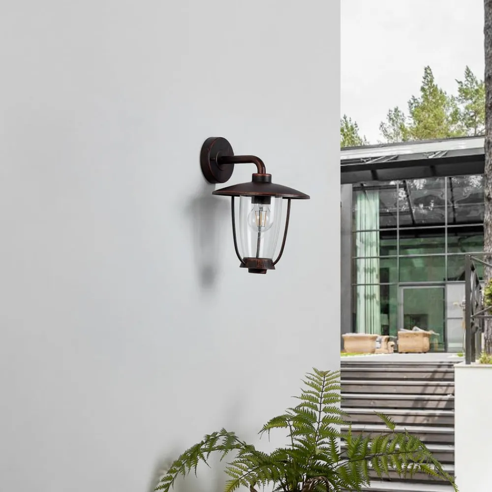 Satish udendørs væglampe med lanterne-look – den markante jernkammerat til udendørs brug Denne væglampe er et fremragende valg til en hyggelig udendørs belysningsoplevelse. Den udendørs væglampe kan dæmpes efter eget ønske med en ekstern lysdæmper (medfølger ikke) og har en IP44-beskyttelsesgrad, hvilket betyder, at den er beskyttet mod indtrængen af faste fremmedlegemer med en diameter på mere end 1 mm og vandsprøjt. Dens enestående design gør den til en behagelig tilføjelse til belysningskonceptet i ethvert udendørs område. Den udendørs væglampe i farven kobber oplyser dit interiør med en stemningsfuld lyskilde. Den smukke lampe har et design, der er let at kombinere, og som giver din indretning en fantastisk atmosfære. Den udendørs væglampe er lavet af jern og plast og supplerer dit udendørs område takket være sin antikke stil. Du kan bruge en lyskilde med E27-sokkel i denne udendørs væglampe. Lampen er perfekt til at afrunde udseendet på alle udendørs møbler. Denne udendørs væglampe udsender et hyggeligt og indbydende lys, som skaber den perfekte stemning i dit udendørs område.