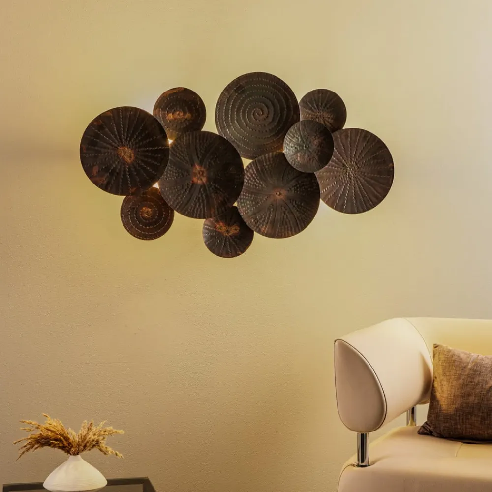 Kobberfarvet Soraya-væglampe, to lys Soraya-væglampen er designet i orientalsk stil og fremstillet af robust jern. De kobberfarvede elementer giver den et strejf af elegance og udgør de skærme, der dækker lyskilderne. Skærmene er runde i formen, varierer i størrelse og er dekoreret med forskellige mønstre, hvilket gør dem til et unikt blikfang i ethvert rum.