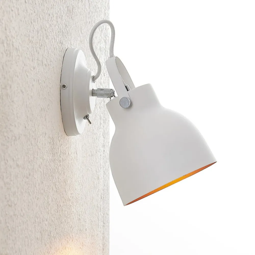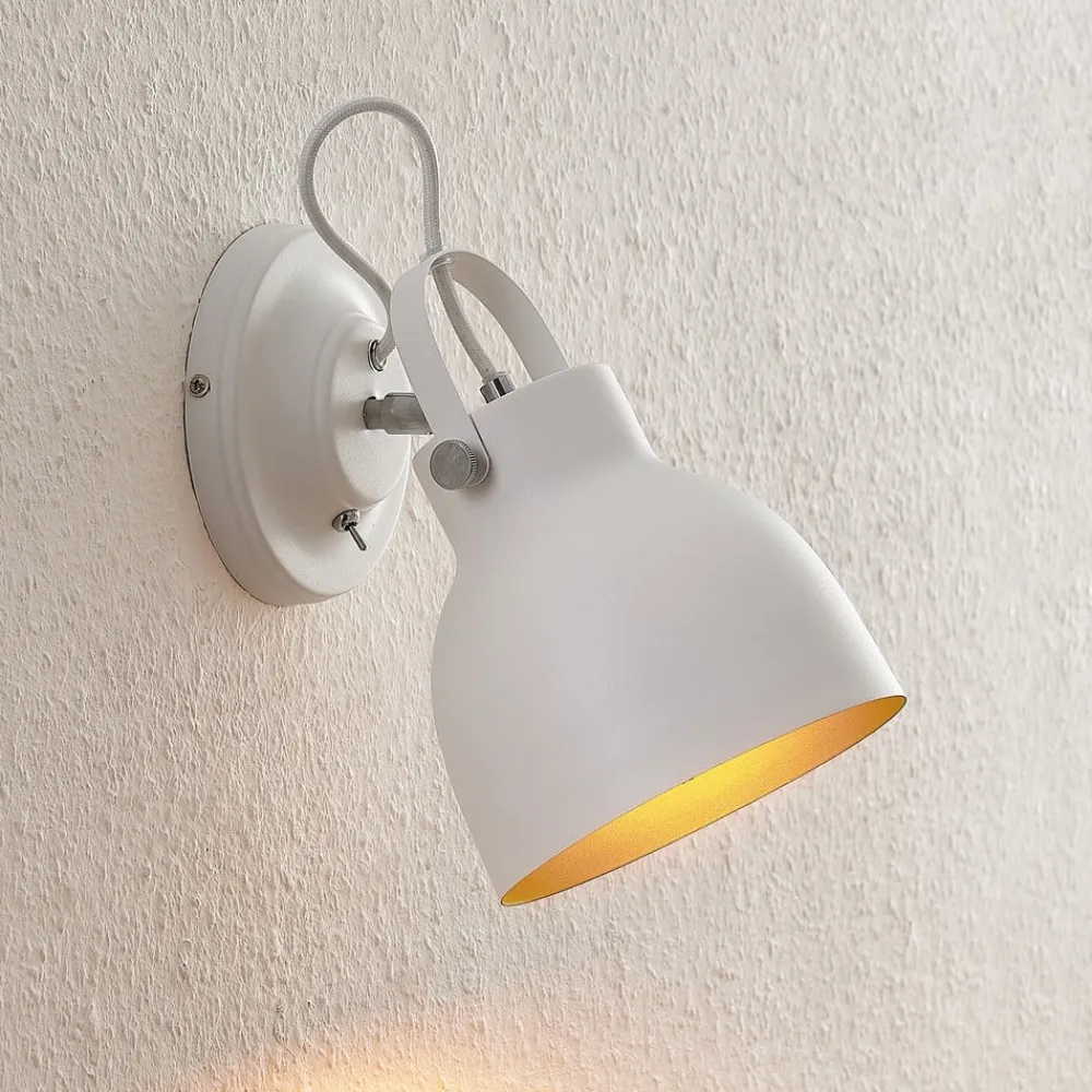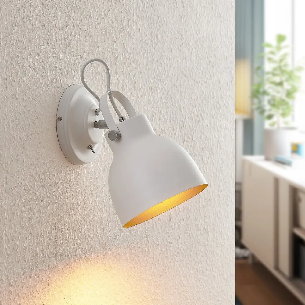 Hvid metal væglampe Adirta med smuk indvendig finish i guld, perfekt til montering i stuen eller soveværelset takket være den integrerede vippekontaktAdirta overbeviser med et ædelt, ret tidløst look og er en væglampe, der kan integreres godt i mange forskellige stilarter, fra vintage til skandinavisk interiør til moderne interiør. Selv i et industrielt look ser væglampen ikke malplaceret ud med sin metalskærm. Skærmen er ligesom stellet hvid udvendigt – en meget tidløs, harmonisk farve – og har desuden en guldfarvet inderside, som ikke blot påvirker looket elegant, men også tilføjer en varm og hyggelig tone til lysbilledet. Adirta er derfor en lyskilde til hele boligområdet, der er værd at se på. Den placeres bedst inden for rækkevidde af sofaen eller sengen, fordi en integreret afbryder gør det muligt at tænde og slukke den direkte på stedet. Desuden kan lyset justeres, fordi skærmen er forbundet med den runde holder via et led og dermed kan drejes.