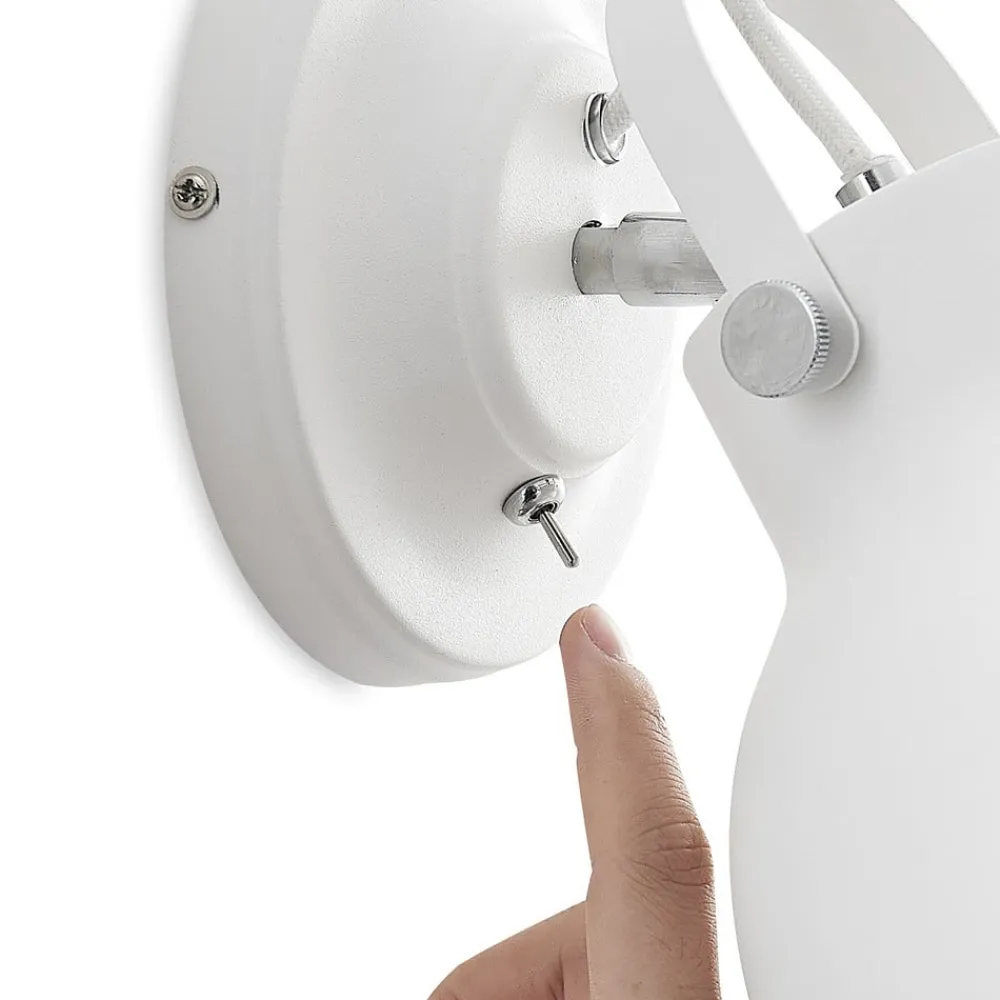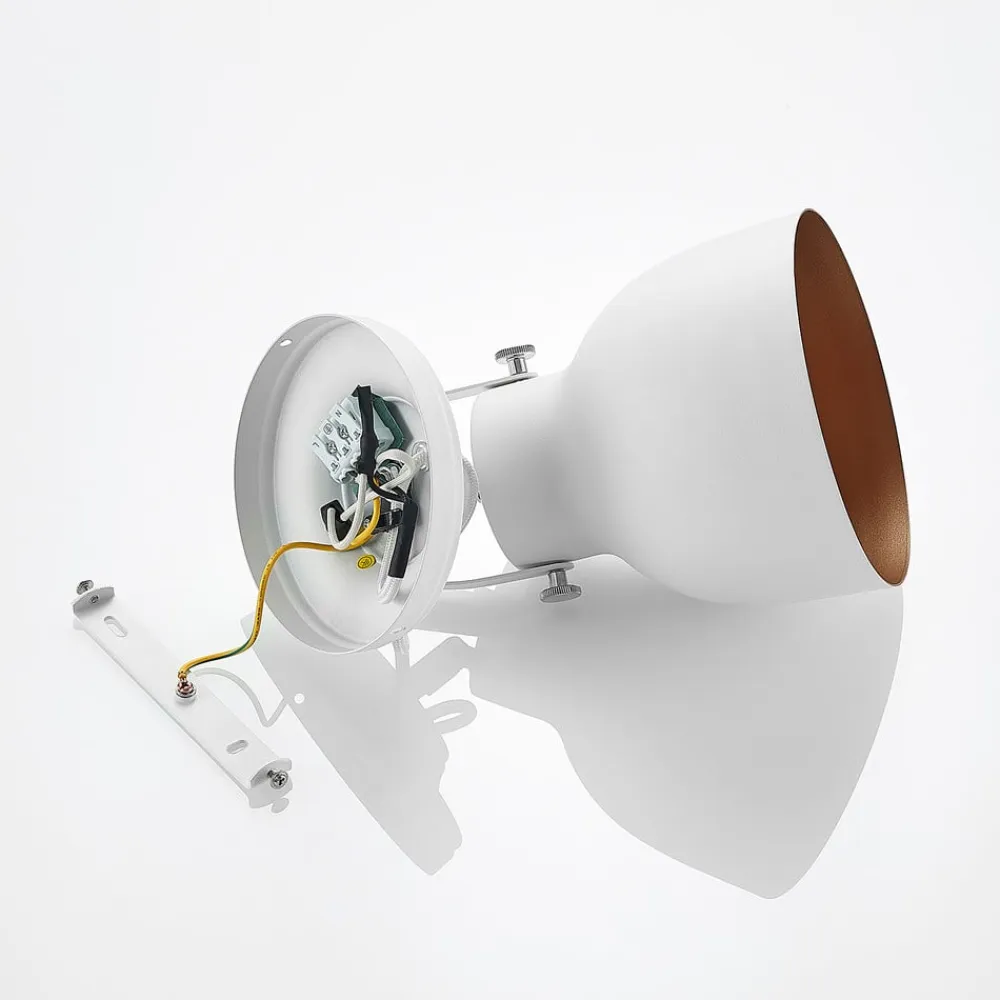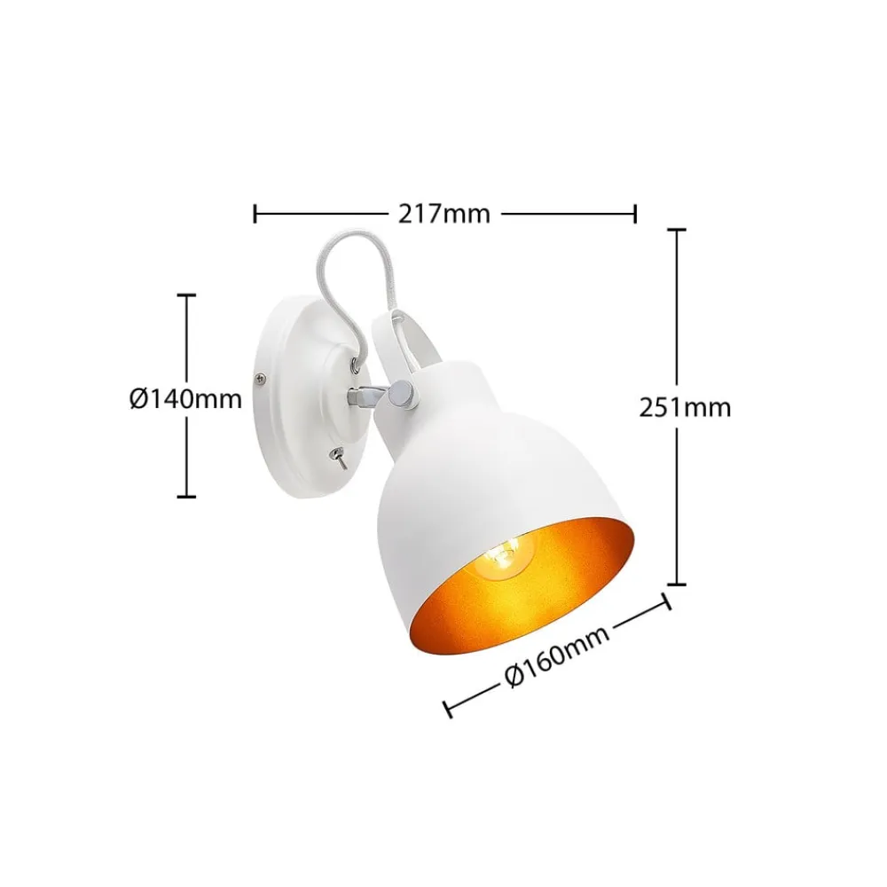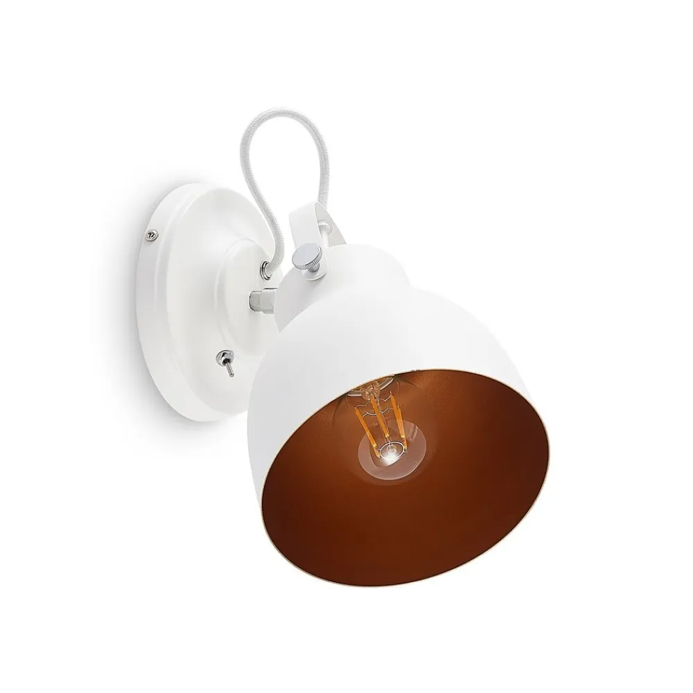 Hvid metal væglampe Adirta med smuk indvendig finish i guld, perfekt til montering i stuen eller soveværelset takket være den integrerede vippekontaktAdirta overbeviser med et ædelt, ret tidløst look og er en væglampe, der kan integreres godt i mange forskellige stilarter, fra vintage til skandinavisk interiør til moderne interiør. Selv i et industrielt look ser væglampen ikke malplaceret ud med sin metalskærm. Skærmen er ligesom stellet hvid udvendigt – en meget tidløs, harmonisk farve – og har desuden en guldfarvet inderside, som ikke blot påvirker looket elegant, men også tilføjer en varm og hyggelig tone til lysbilledet. Adirta er derfor en lyskilde til hele boligområdet, der er værd at se på. Den placeres bedst inden for rækkevidde af sofaen eller sengen, fordi en integreret afbryder gør det muligt at tænde og slukke den direkte på stedet. Desuden kan lyset justeres, fordi skærmen er forbundet med den runde holder via et led og dermed kan drejes.