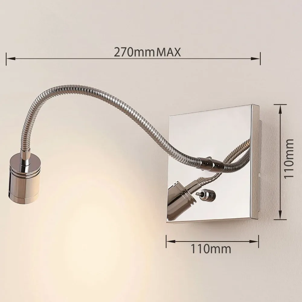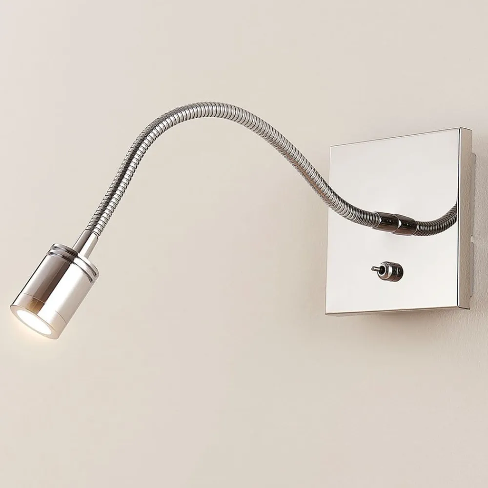 LED læselampe Berfin i skinnende krom med bøjelig svanehals og kontakt