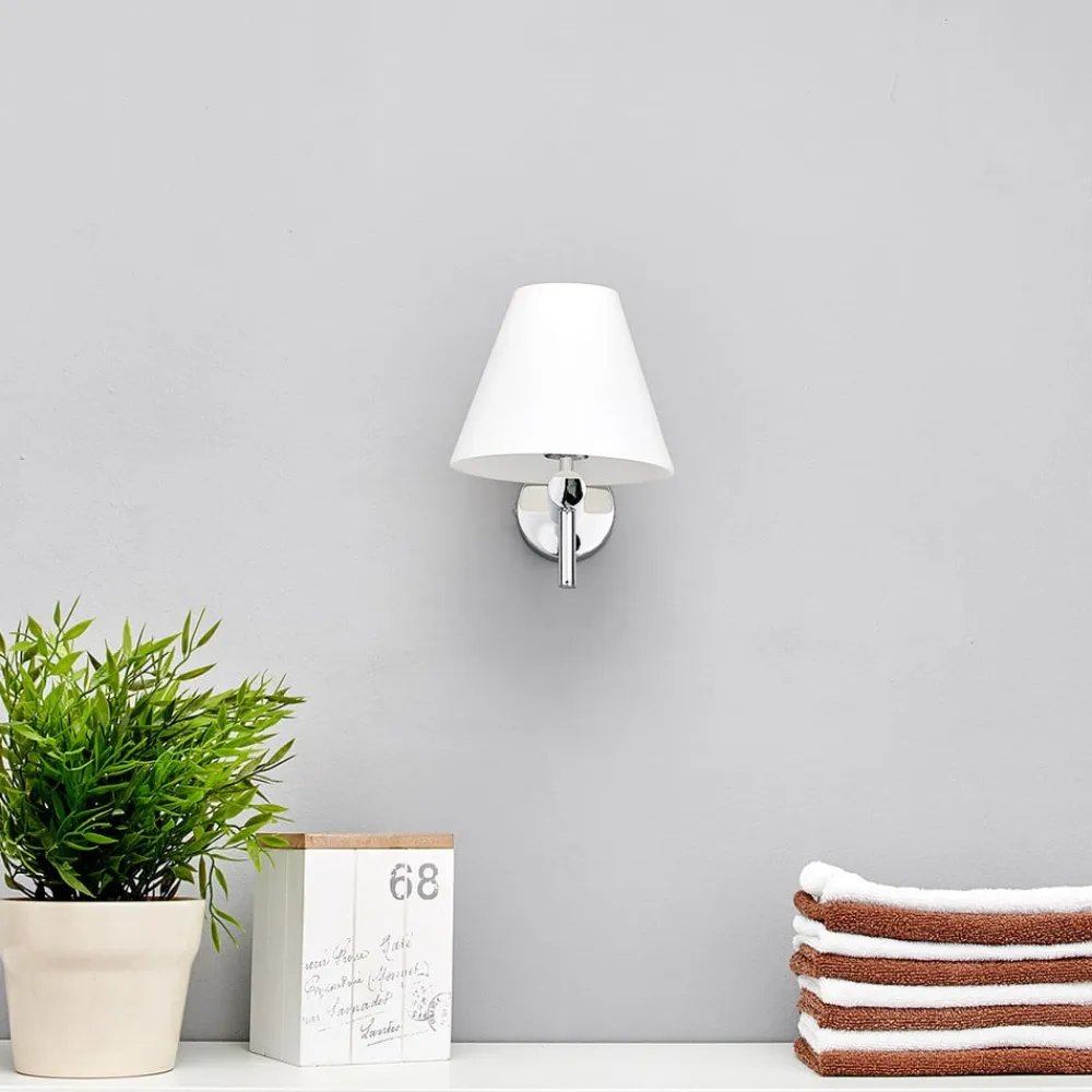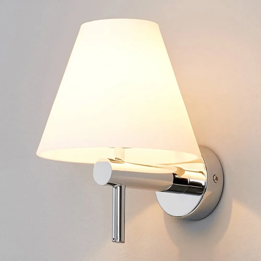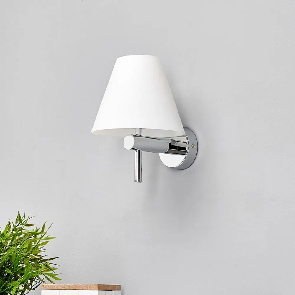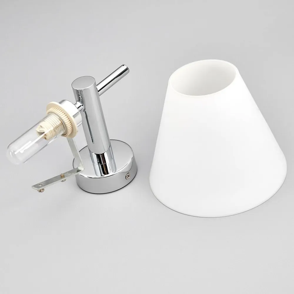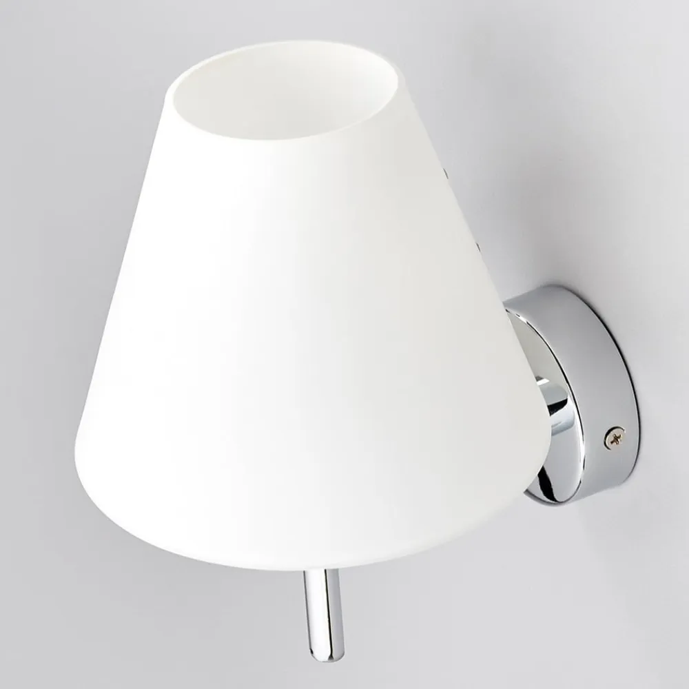 Skærme, der bliver smallere mod toppen, kan betegnes som en stereotyp for den elektriske belysning, fordi det er en meget klassisk, og har været det i årtier, hvis ikke altid. Skærmen på denne væglampe består af opalt glas, som sørger for en fantastisk varme og blød fordeling af lyset. Vægbeslaget er af skinnende krom. Denne harmoniske farve- og materialekombination passer til mange stilarter og væglampen ser fremragende ud ved siden af et spejl og tillæger det en særlig elegance.