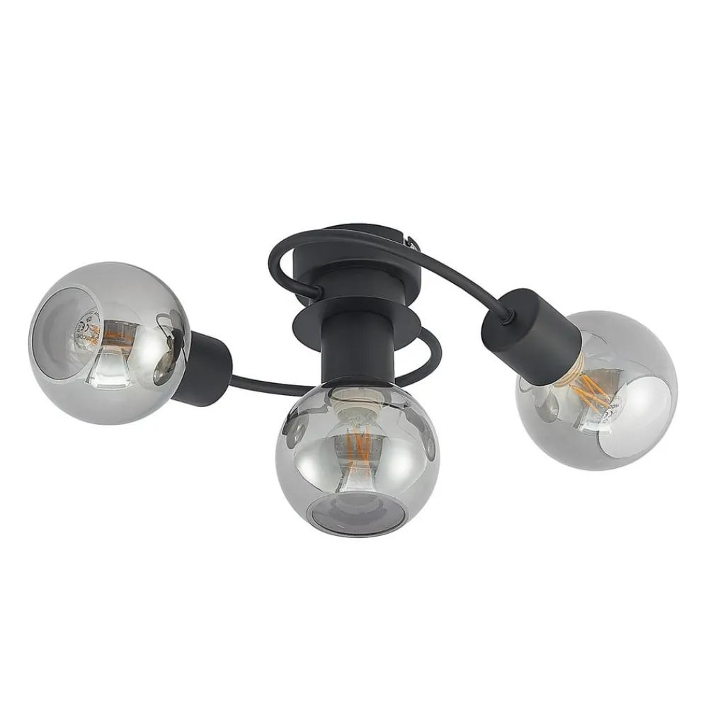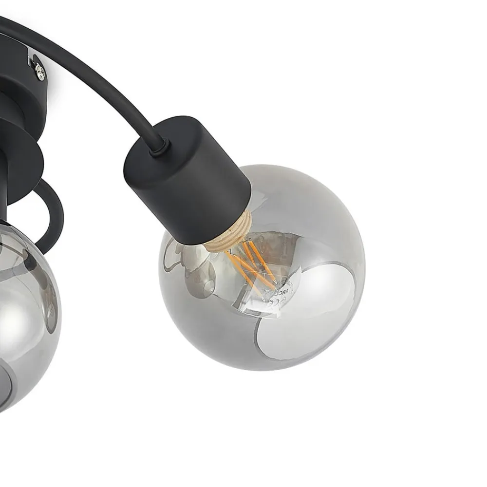 Moderne loftlampe Ciala i et mørkt look Denne lampe giver et moderne touch til indretningen og ser meget stilfuld ud i loftet. Den er lavet af jern og har en sort overfladefinish. De tre lampeskærme er lavet af mørkt røgfarvet glas og afrunder designet harmonisk. Ciala-loftlampen kan bruges i mange forskellige rum og kan kombineres med forskellige stilarter.