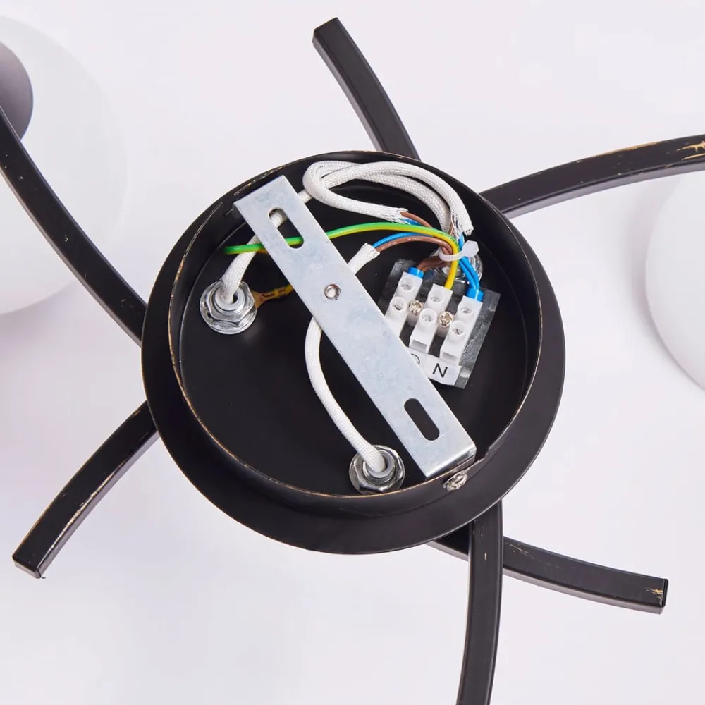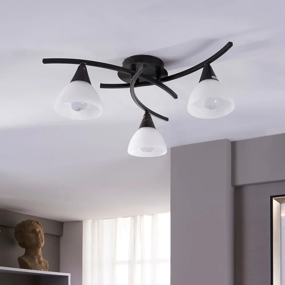 Elegant loftlampe Della med alabastfarvet glas Della består af hvide skærme med et alabastfarvet skær og en interessant formet ramme, der består af tre buede arme. Ligesom loftbeslaget er disse lampearme sortmalede og har en guldfarvet børstefinish, som ikke kun ser elegant ud, men også giver loftlampen et lidt mere rustikt udseende. Som loftlampe kombinerer Della et stærkt lys, der passer til mange boligområder, med et lavt energiforbrug, da energibesparende LED-pærer også kan bruges her.