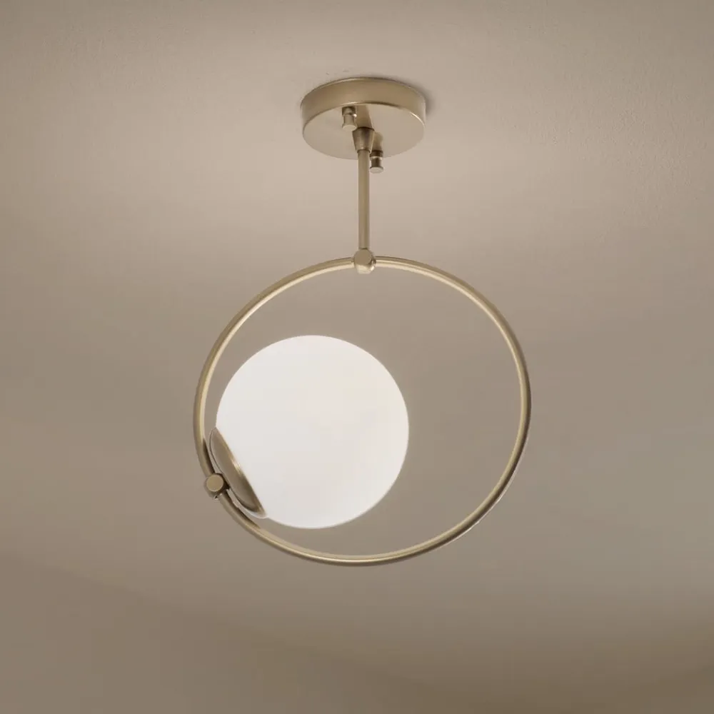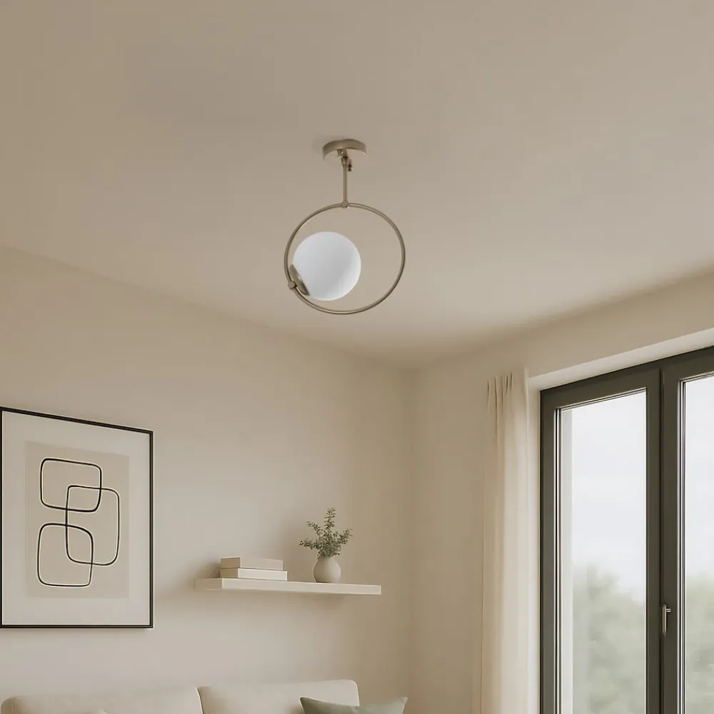 Loftlampen Dolunay kombinerer et moderne design med materialer af høj kvalitet som metal og glas for at skabe en stilfuld belysningsløsning. Med sin guldfarvede finish og opalhvide lampeskærm i glas sætter den et elegant præg i ethvert rum. Lampen er ideel til forskellige boligområder såsom stuer, spisestuer, entreer, køkkener og badeværelser og passer perfekt ind i forskellige indretningsstilarter.