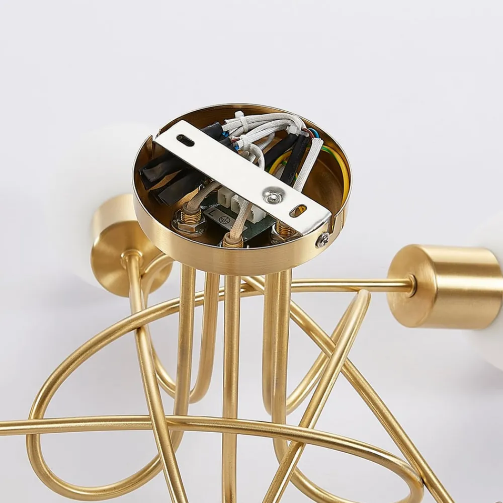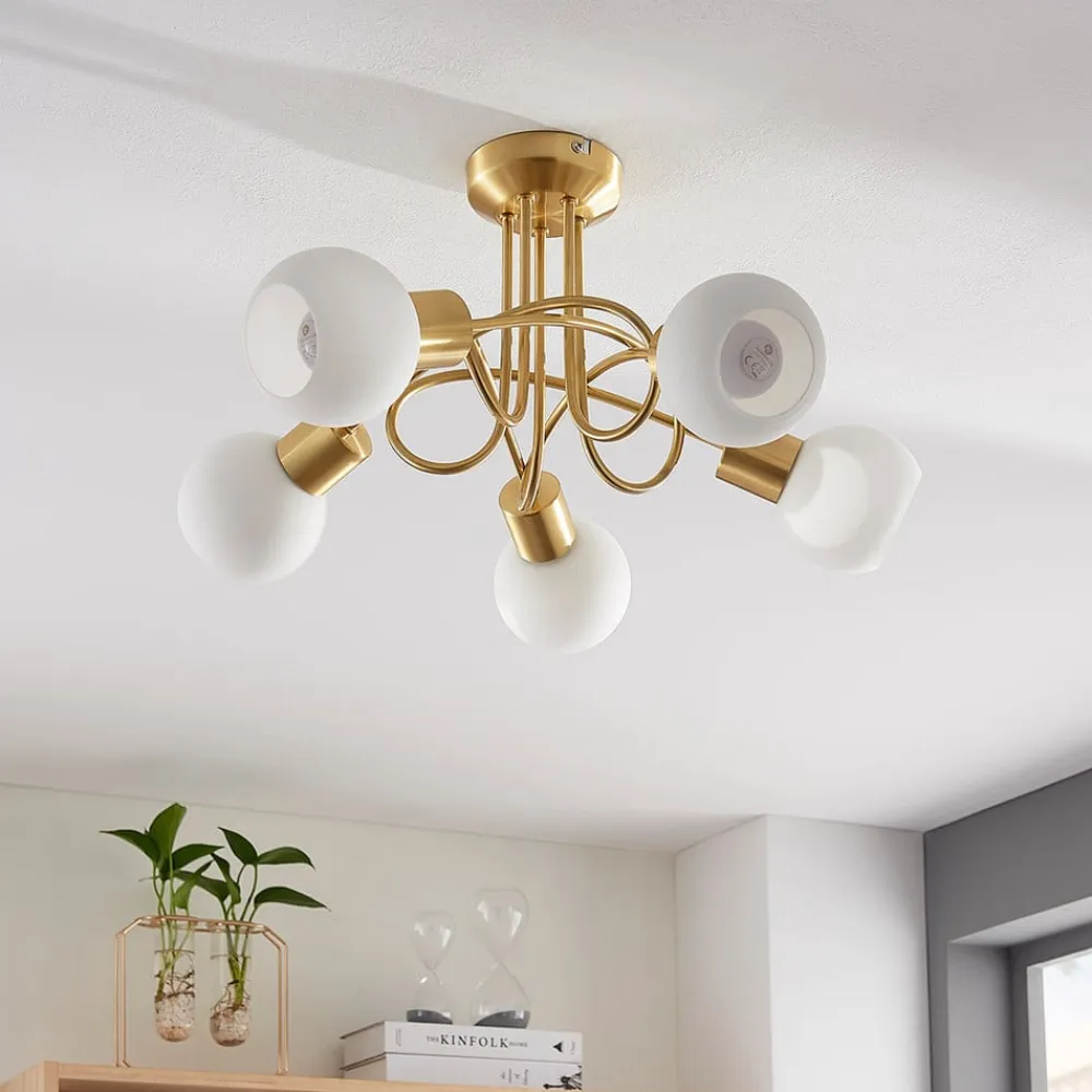 Klassisk udseende Elaina-loftlampe Elaina har en kompliceret udseende ramme med en attraktiv, klassisk udseende messingfinish. Loftlampens ramme suppleres af fem opalhvide glasskærme, som har en sfærisk form og er åbne foran. Der kan bruges energibesparende LED-loftlamper i dem, og lyset fremstår ensartet og hyggeligt, hvilket gør loftlampen lige velegnet til stue og soveværelse.