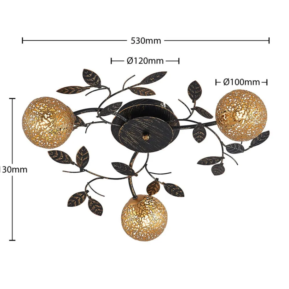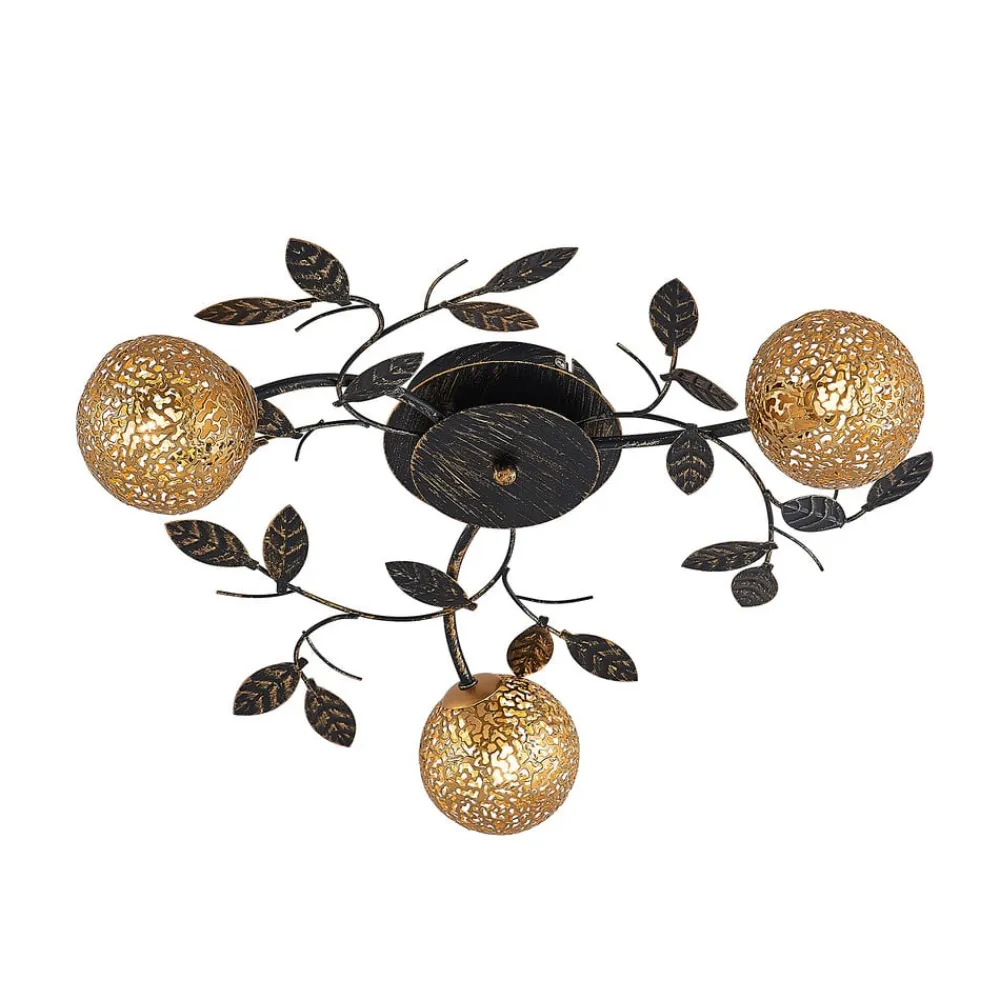 En blanding af blomster og marokkanske elementer – Evory loftlampe Evory loftlampen består af en rund loftplade, hvorpå der er tre lampearme, hver med en rund lampeskærm. Disse lampearme stikker legende ud i rummet. De er også dekoreret med fine blade, som får dem til at minde om blomsterranker. Lampeskærmene er kugleformede og har et filigranmønster. Dette mønster giver lampen et orientalsk præg. I kombination med bladene er Evory et usædvanligt og legende blikfang.