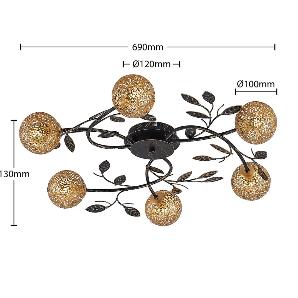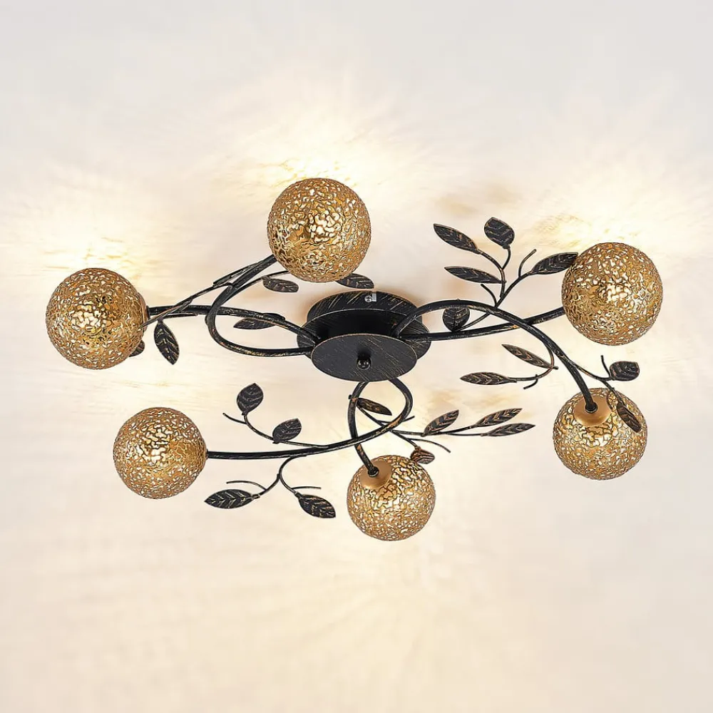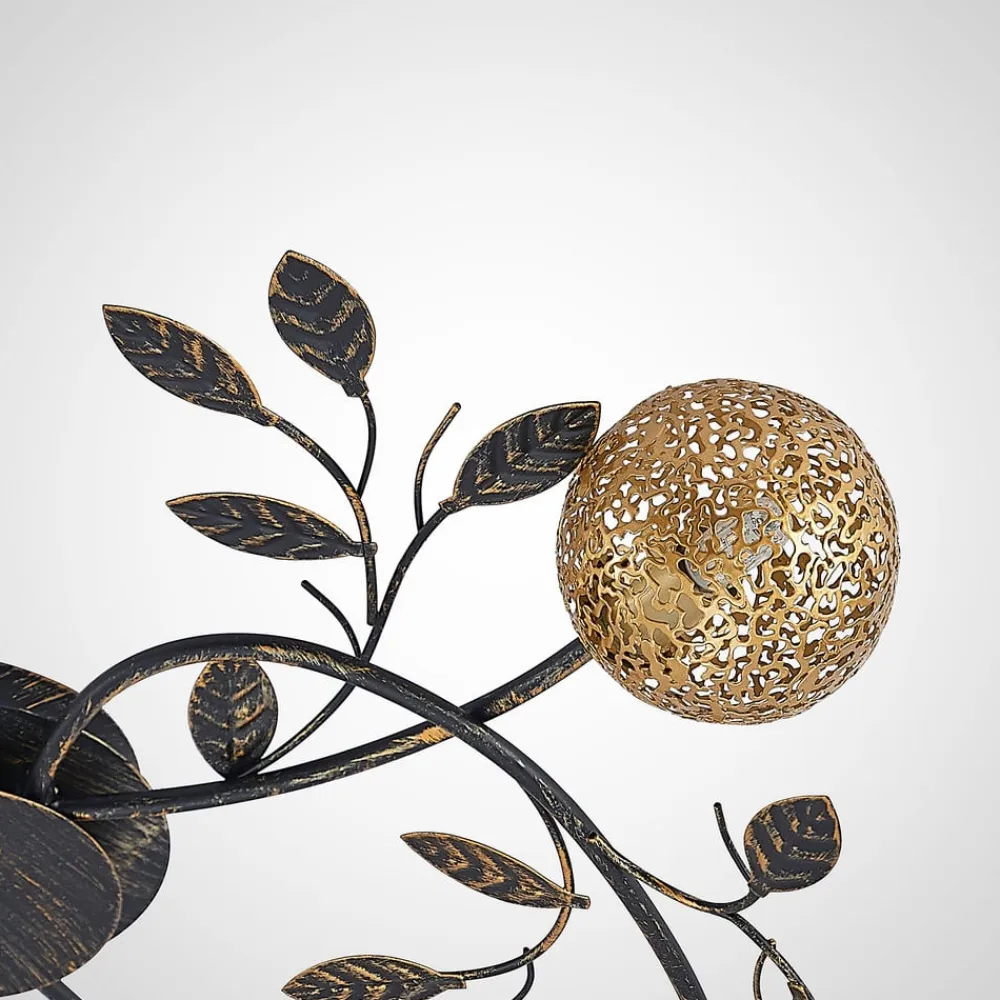 Evory loftlampe kombinerer blomster og orientalske elementer for at skabe et kunstværk Evory er en loftlampe, der dygtigt kombinerer blomster og orientalske elementer. Den består af en rund loftsplade, hvorfra tre lampearme rager ud i rummet. Siderne af lampearmene er dekoreret med blade, der giver indtryk af, at blomsterranker er på vej ind i rummet. De kugleformede lampeskærme giver lampen et orientalsk præg. De er lavet af metal og har en finish i guld. Det særlige ved skærmene er det fine mønster, der er skabt af udskæringer i metallet. Dette mønster minder om lamper fra Orienten og skaber samtidig et romantisk lysspil, hvor skygge og lys kombineres til en kunstnerisk helhed.