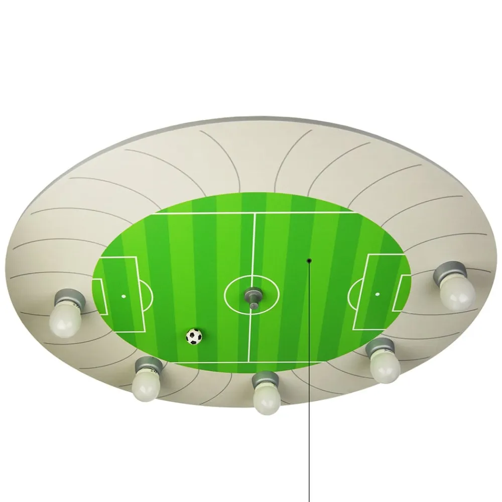 Loftslampen Fodboldstadion er et absolut must for alle fodboldfans. Lampen er ovalt formet. I midten af lampen befinder der sig en indtegnet fodboldbane, hvor man endda kan finde en bold. Den ydre, hvide kant danner en tribune. Den har fem lyskilder med E14-fatninger, hvilket gør lampen ideel til generel belysning. Dog egner loftslampen Fodboldstadion sig også utroligt godt til ren dekorationsbelysning. Hovedbelysningen kan tændes eller slukkes ved hjælp af trækafbryderen. LED-lyspunkterne betjenes med kontakten i rummet. Hvis hovedbelysningen er tændt, tændes eller slukkes denne ved hjælp af kontakten i rummet. LED’erne er monteret bag lampen og skaber en indirekte belysning. Lampen sørger for sjov og dejligt lys til ethvert børneværelse.