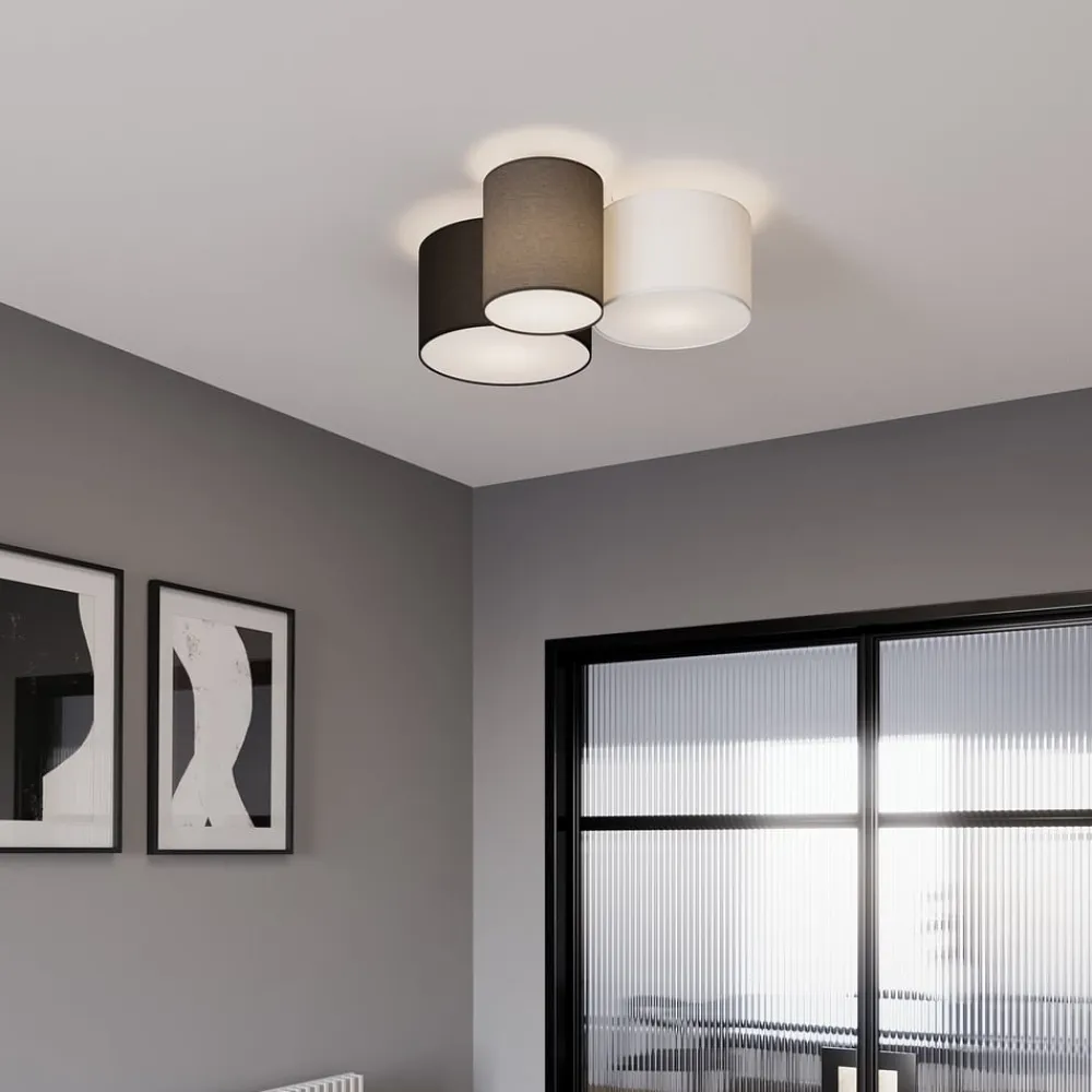 Laurenz 3 lyskilder loftlampe i stof med skærme i forskellige farver og størrelser Stofskærmene på denne loftlampe er alle runde i formen og forholdsvis flade. Størrelsen og farven på de enkelte skærme varierer dog. De valgte farver er hvid, grå og brun, som ser ret jordnære ud og derfor kan kombineres godt med tilsvarende indretningsfarver. De skaber også et behageligt lys, især fordi der er en hvid diffuser på undersiden af hver skærm, som gør, at lyset spredes særligt jævnt.