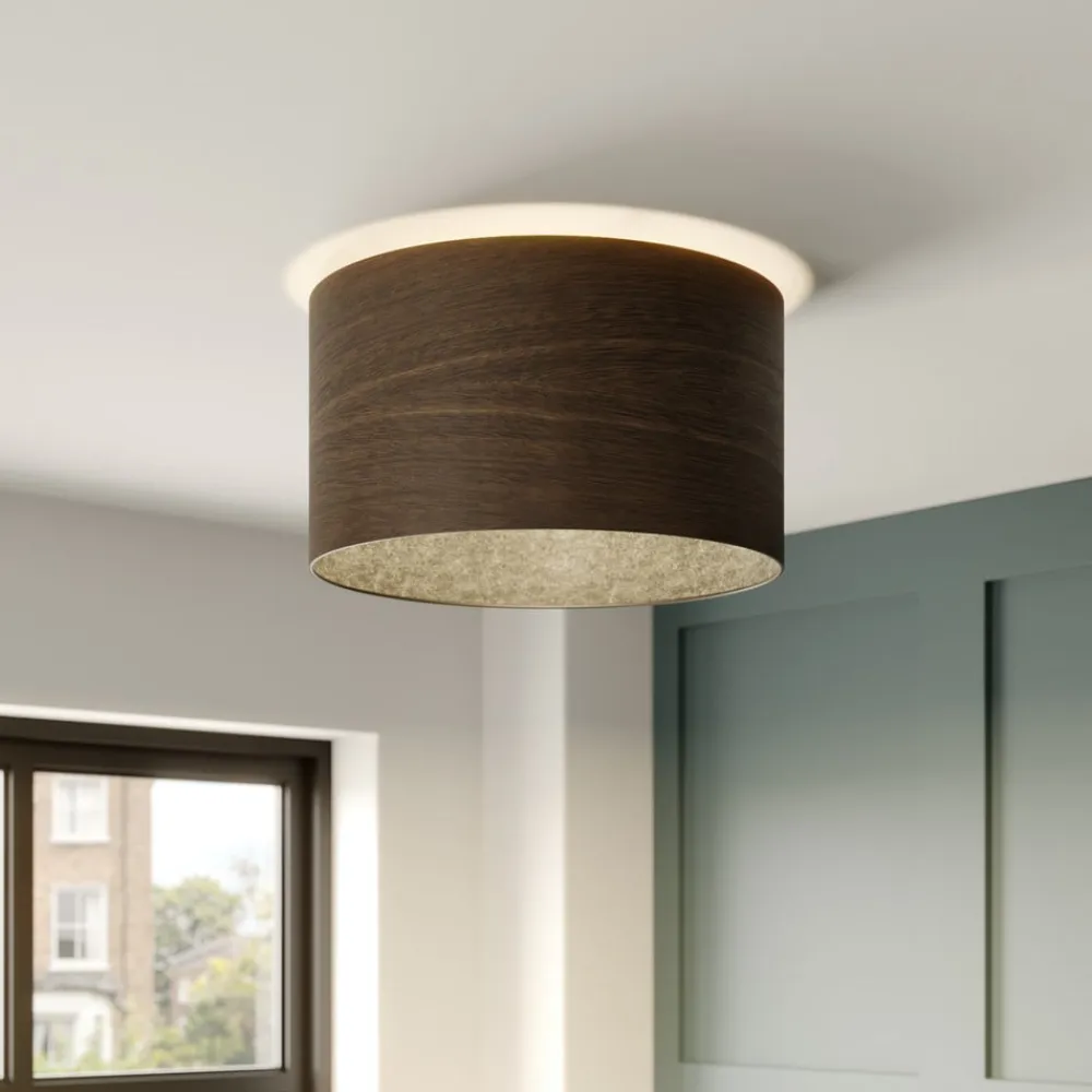 Med skærm af røget egetræsfiner – loftslampe af finér Skærmens egetræsfiner er røget for at give den en næsten sort farve. De naturlige årer er bevaret. Det giver Veneer-loftslampen et særligt elegant udseende. Takket være den vertikalt åbne cylindriske form giver den direkte belysning af området nedenunder. Envostar-armaturerne er fremstillet i Europa, hvilket reducerer transportafstandene og den dermed forbundne CO2-udledning. Desuden anvendes der ikke plast, polystyren osv. i emballagen.