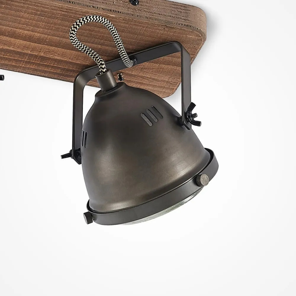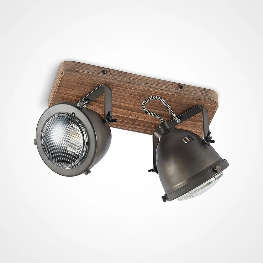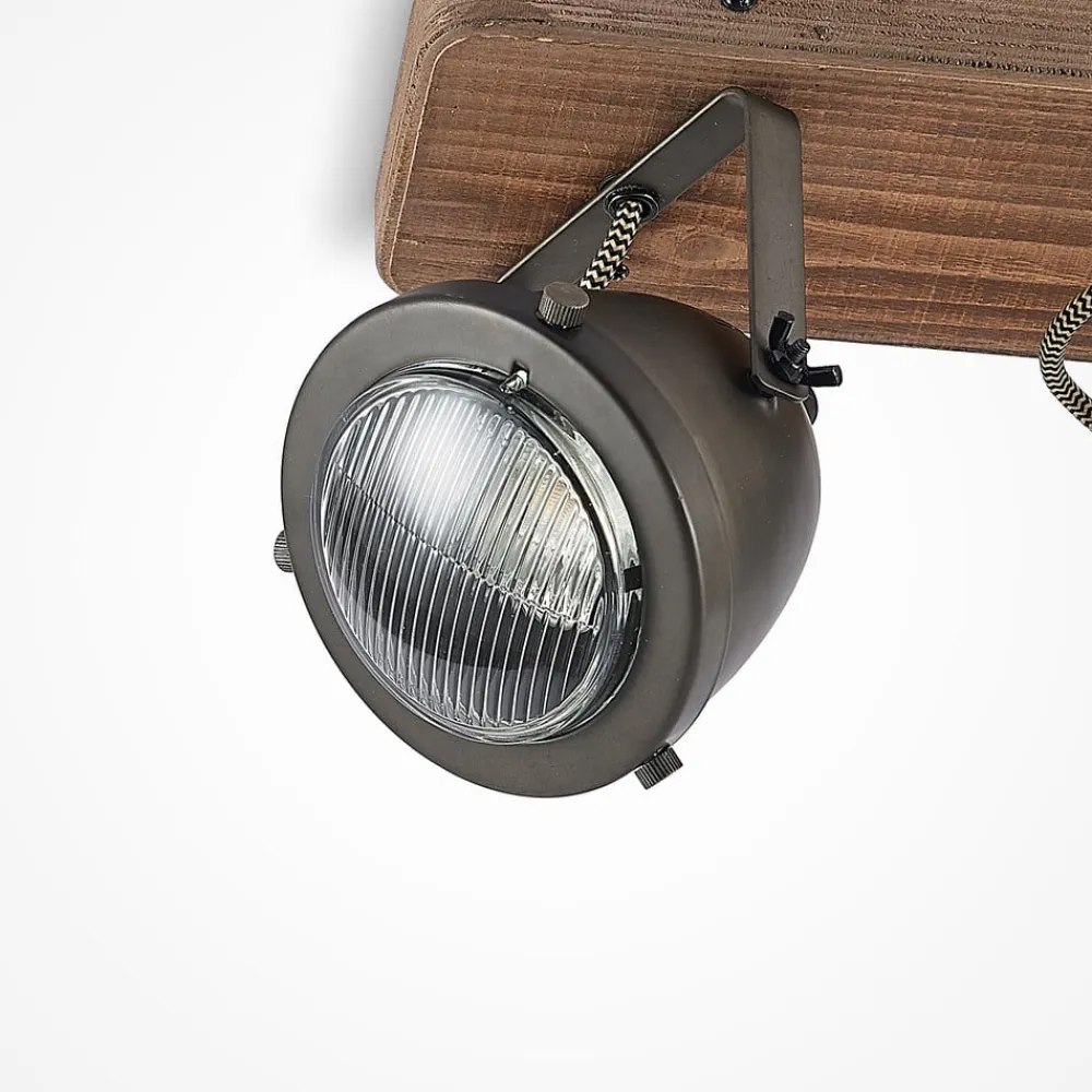Farovi 2 lyskilder, sort med baldakin To sorte metalspots med en forside af klart glas med riller udgør skærmene på Farovi 2 lyskilder, og deres design minder om spotlights på en klassisk bil. Spotlightsene er fastgjort til træbaldakinen med beslag og kan drejes og svinges, så de kan lyse i forskellige retninger. Loftlampen med vintagecharme passer ind i rum, der er indrettet i denne stil, men skaber også en interessant accent i andre indretninger.