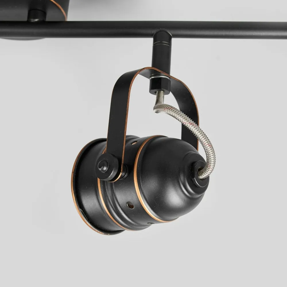 Sort og guld loftlampe Leonor med justerbare metalskærme Leonor er en loftlampe, der kan bruges til at oplyse rum, der stilmæssigt er forbundet med vintage-looket. Overfladedesignet har et antikt præg, da sort og guld kombineres smukt. Fordi hver skærm kan justeres, kan lysets retning tilpasses meget individuelt. Loftlampen kan varmt anbefales til belysning af køkkener eller andre rum, hvor der er behov for stærkt lys.