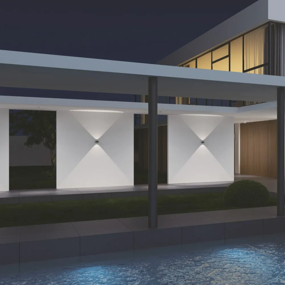 Moderne Frey LED-væglampe til en tiltalende op-og-ned-accent Med sin ensfarvede aluminiumskrop, der slutter ved væggen som en kubus og er formet som en cylinder foran, harmonerer Frey LED-væglampen vidunderligt med alle moderne miljøer. Den kan bruges i stuer og lounges, såvel som på badeværelser og udendørs. Lyset udsendes lodret på begge sider gennem klare glaslinser i en vinkel på 100°. Resultatet er skarpt definerede lyskegler over og under væggen, som kan bruges til målrettet arkitektonisk lysdesign – Beskyttelsesklasse: IP65